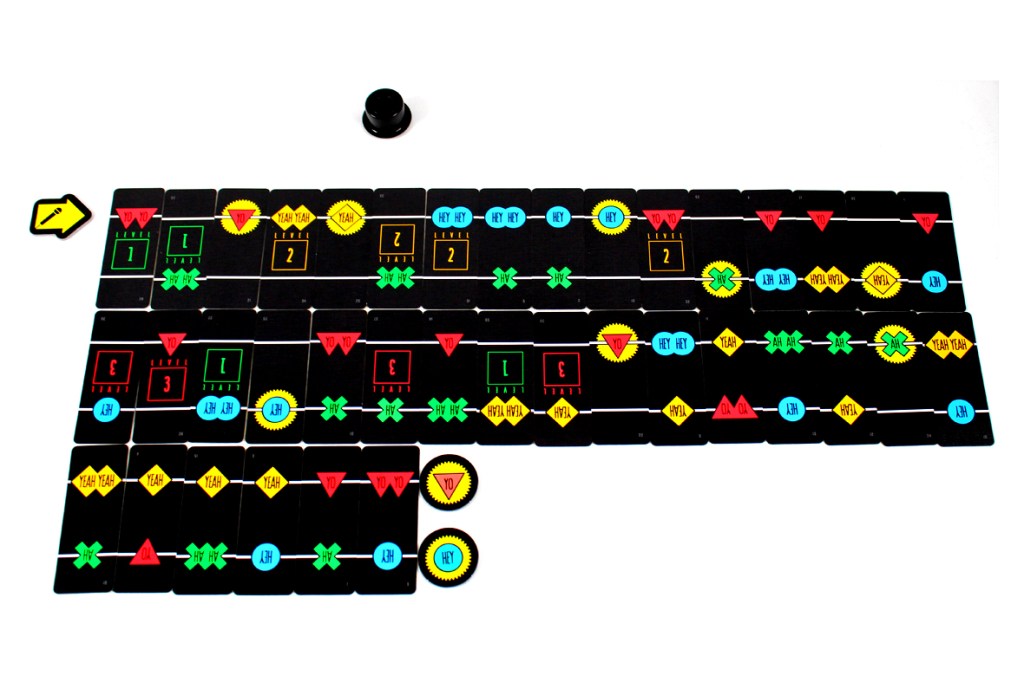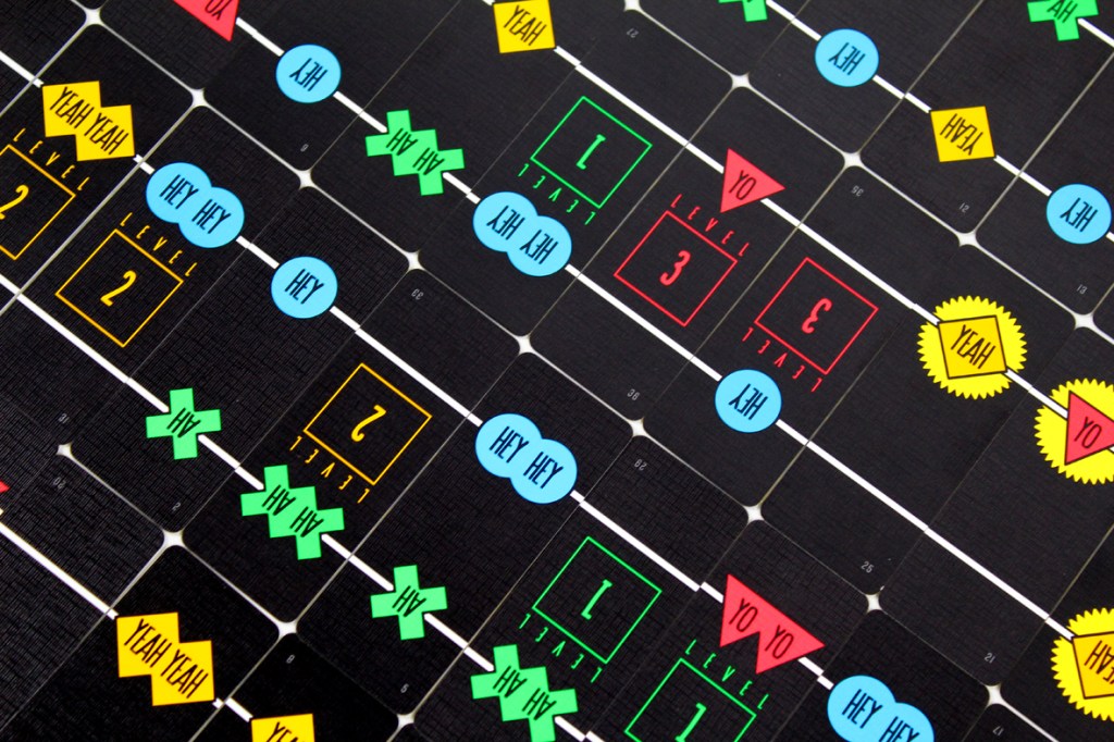 In Hey Yo, you play cards on the beat. The first time, you have until the second beep to play a card (play it on the second beep) face-up next to either the start line or next to another card in play, but after that players must play a card on the beep. If they can’t, they take a penalty by flipping the earliest face-up card in play.