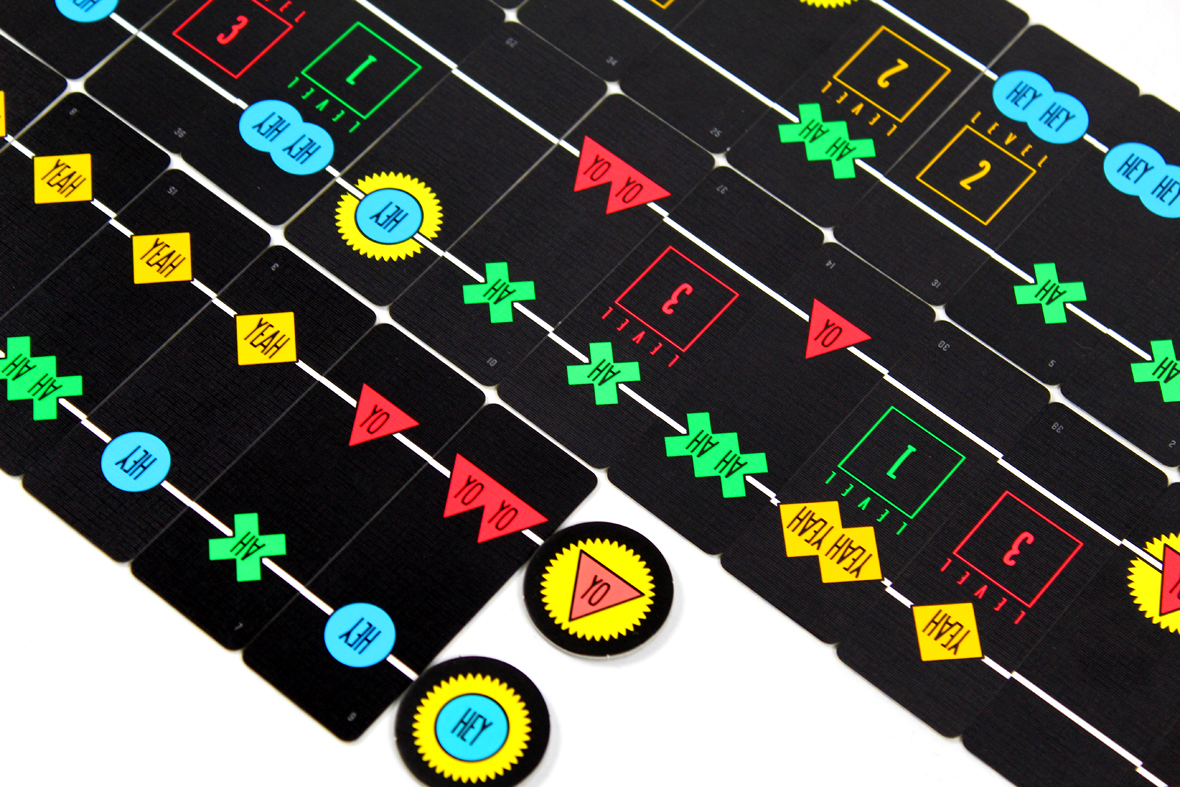 In Hey Yo, you play cards on the beat. The first time, you have until the second beep to play a card (play it on the second beep) face-up next to either the start line or next to another card in play, but after that players must play a card on the beep. If they can’t, they take a penalty by flipping the earliest face-up card in play.