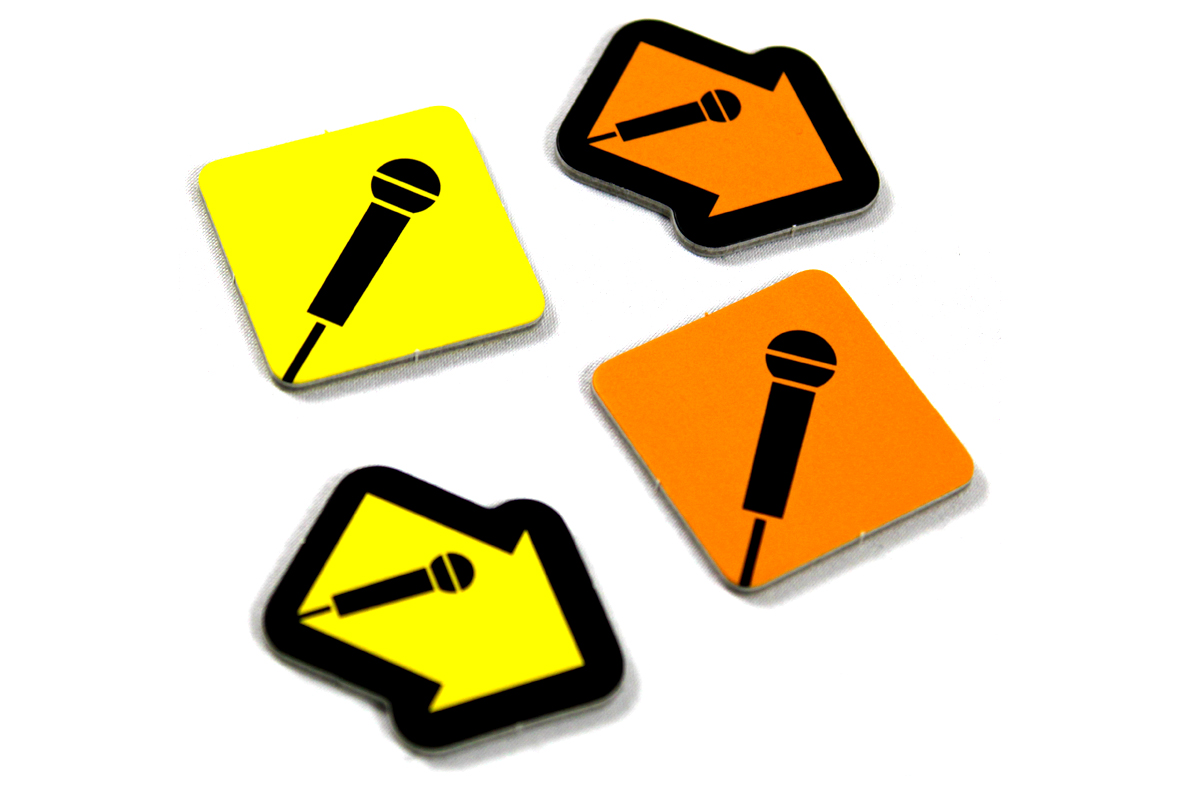 After everyone has played all of their cards, the round ends. Stop the speaker by pressing the button again, and place the two bonus chips next to the two lines on the cards. You can discuss, collectively, which chip goes at the end of which line, but the Leader makes the final call.