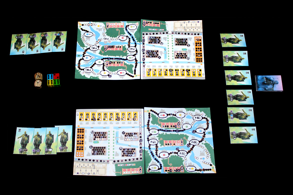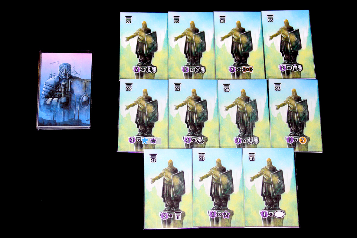 Place one on top of the other; it doesn’t matter which, and then reveal the top 6 Statue Cards to make a row. Once you’ve done that, you should be ready to start!