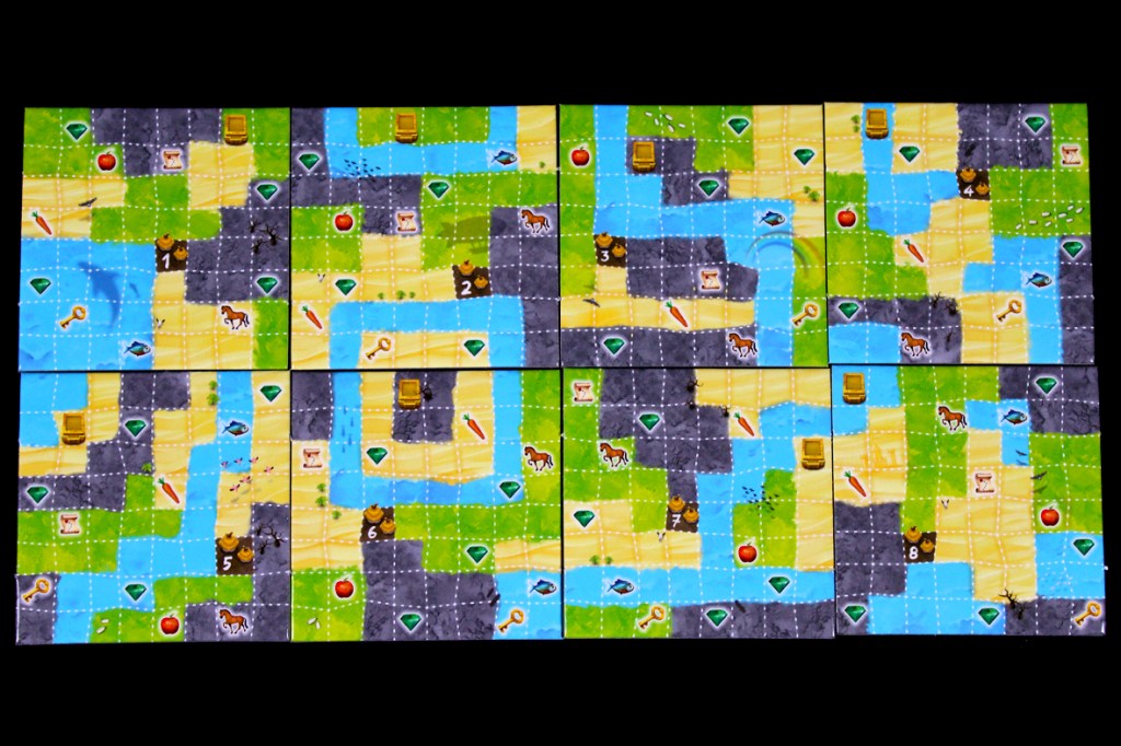 Shuffle one stack of tiles with the 1 – 8 on the Villages, rotate them a few times, and choose four (or just pick what you want) and set them into your player board. The other players must match your numbers, placement, and rotation so that everyone has the same board. It helps if you use the numbers on the Village tiles to help with orientations.