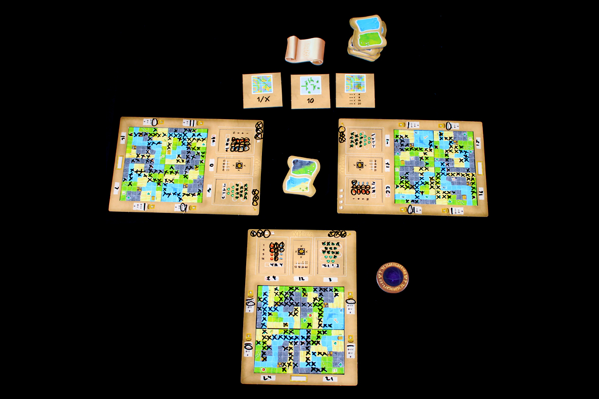 There aren’t a ton! Players don’t really interact with each other; they just primarily interact with the Active Player, since the Active Player chooses which terrain is the Active Terrain. There’s some racing elements, but they’re not too interactive (or too bad). You can kind of see when a player is getting close to scoring, granted, but you can’t really do anything about that beyond beating them to it. Since all the turns are simultaneous, the game time isn’t even really extended all that much (unless you have a player who’s very indecisive, but then again, there aren’t all that many places you can go). I like that! It means you get a lot of interesting and complex options since everyone is doing some similar things and some different things. But, as a cool bonus, it also means that you don’t see a ton of difference between player counts. To some degree, more players means more competition for the racing elements, but there are also more opportunities for players to score for the various racing elements, so I think it mostly evens out. I don’t really have a preference for a player count for Explorers; I’m happy to try it at two, three, or four.