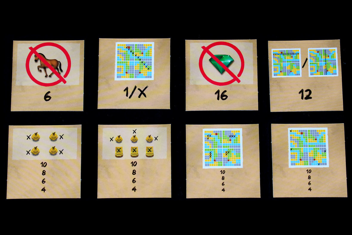 - Similarly, be thoughtful on how to use your horses. Especially be mindful that they actually interrupt your placement of Xs, meaning that you can drop an X on a horse, use the horse’s ability to place an X on a different Terrain type, and then place your remaining two Xs on the same Terrain type as your first X, but in a new area that the horse’s X just connected. It’s a great way to skip over narrow strips of unhelpful Terrain, and I imagine you can find even more useful options for the horses after you’ve played a few games.
