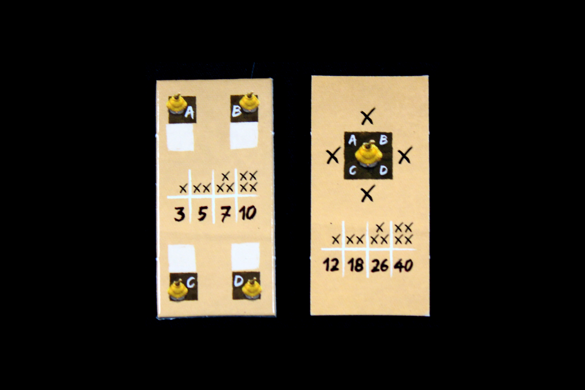- 2 players: Cross off the 10 and 6 (second from the top and the bottom) on all four temple locations.
