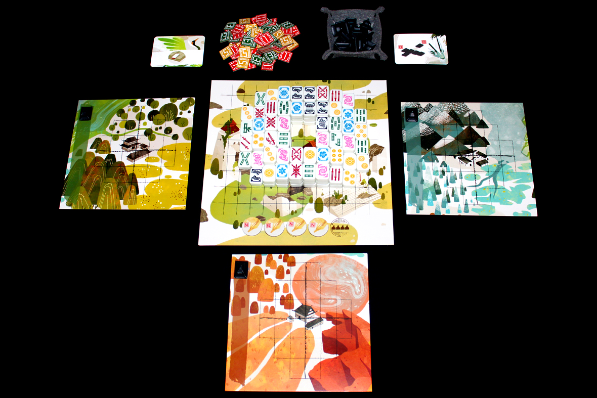 - The Spirit and the Dragon art are both pretty great, as well. I like it! I’m generally a fan of unlined art, since I like the edge-to-edge color contrast (see Samurai Jack for examples), but I think it really pops here and looks solid. There’s a nice use of color everywhere in the game, as well; I really like how the player boards turned out (and I like that they all connect to form a pseudo-panorama!).