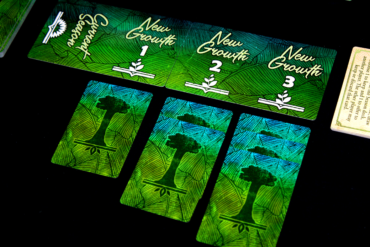 Split the deck into three equal stacks, placing one near the “Current Season” space on the Growth Cards, and the other two near “Season 2” and “Season 3” on the Season Card. Next, place one card from the Current Season Deck below “New Growth 1”, two cards below “New Growth 2”, and three cards below “New Growth 3”. To finish up, give each player a Starting Trunk card: