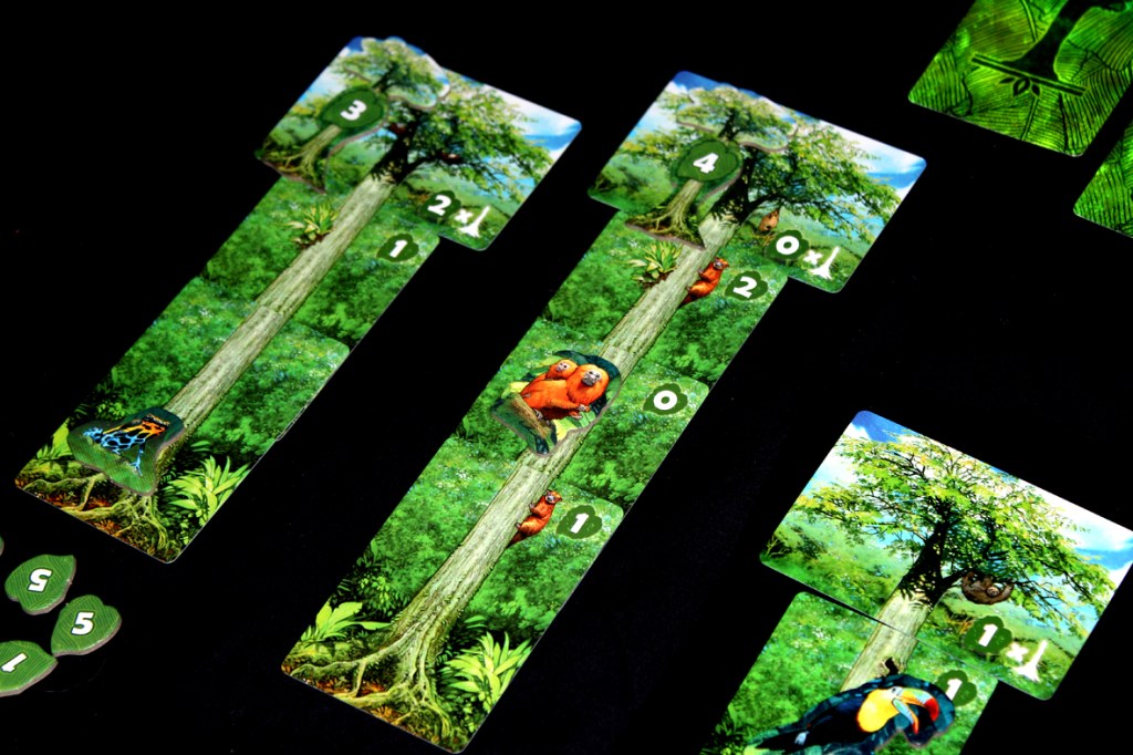 - Trees: Each tree with a Canopy that hasn’t been scored yet gets scored. To score a tree, count up the number of points on Trunk cards and add the points awarded by the Canopy (0 – 2 points per Trunk card). To indicate that a tree has been scored, place a wildlife token on it. You can pick your favorite from the ones remaining, and that’s half the fun.