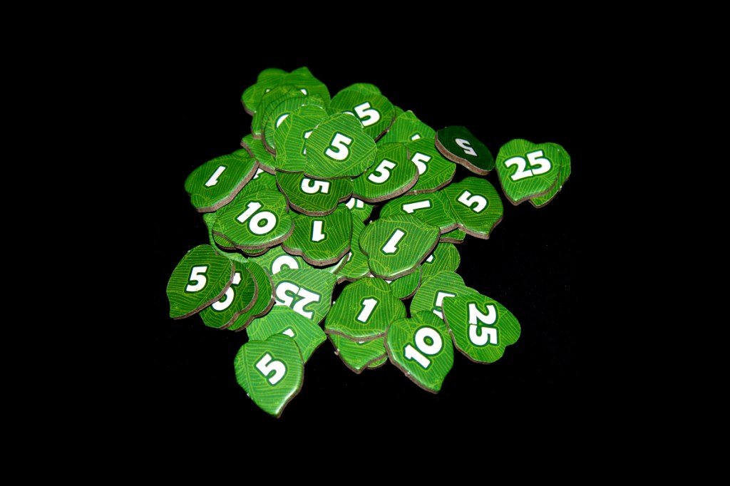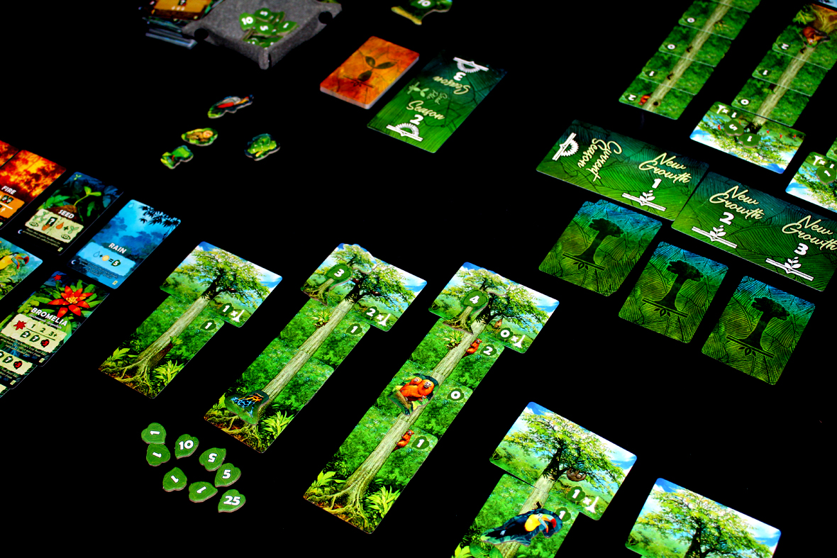 - Tallest Tree: Of the trees without a Tallest Tree token, the complete tree with the most Trunk cards gains the Tallest Tree Token for that season, placing it on its Canopy. This means that you can score Tallest Tree for a Tree that you completed in a previous season. If there’s a tie, both players get the points and place them on their respective Canopies to indicate that the tree can’t be scored again.