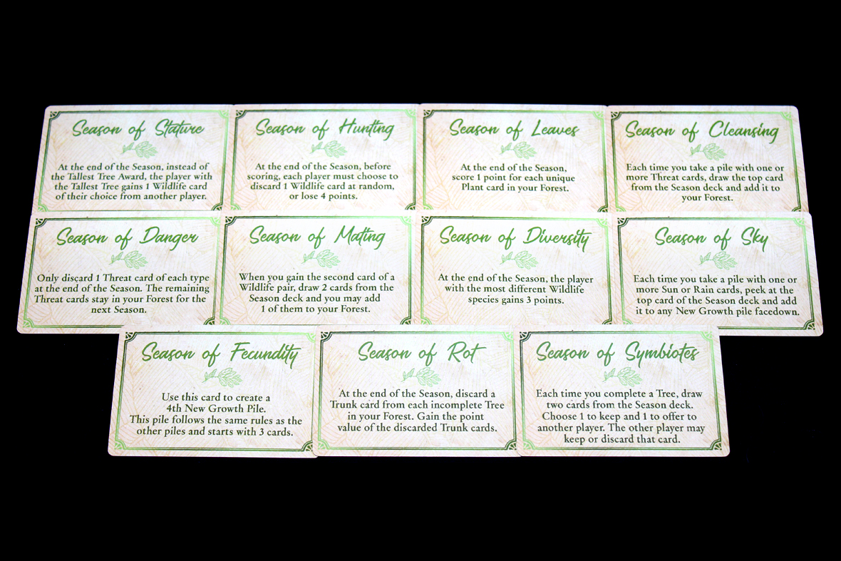 - Weather / Plants / Seeds / Threats: These cards stay in your Forest until the end of the Season, at which point you deal with them.