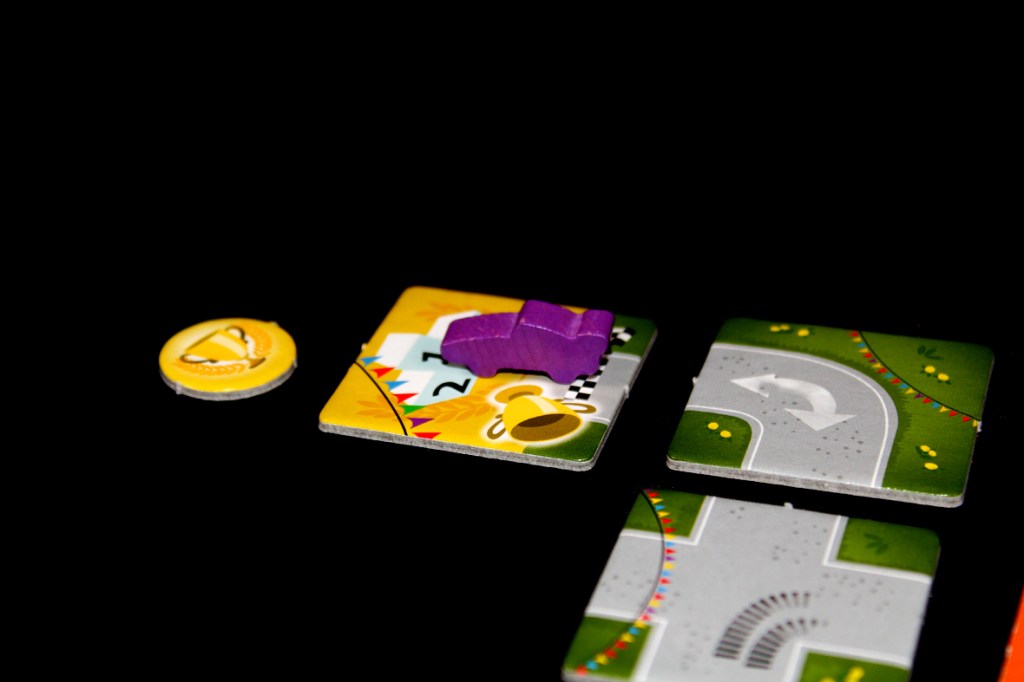 After they do, shuffle the corresponding trophy tokens and place them face-down on the pit stop tile. Then, shuffle the road tiles face-down, and place them in a 5×5 grid with the pit stop tile in the center: