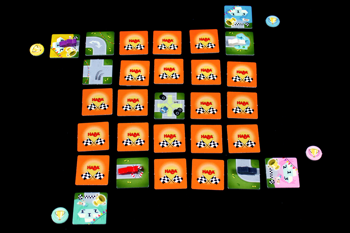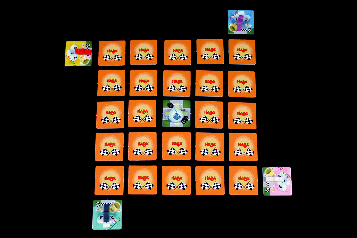 Players should place their start / finish tiles adjacent to one of the corners of the grid (no two players can place adjacent to the same corner), and choose a car to place on the tiles: