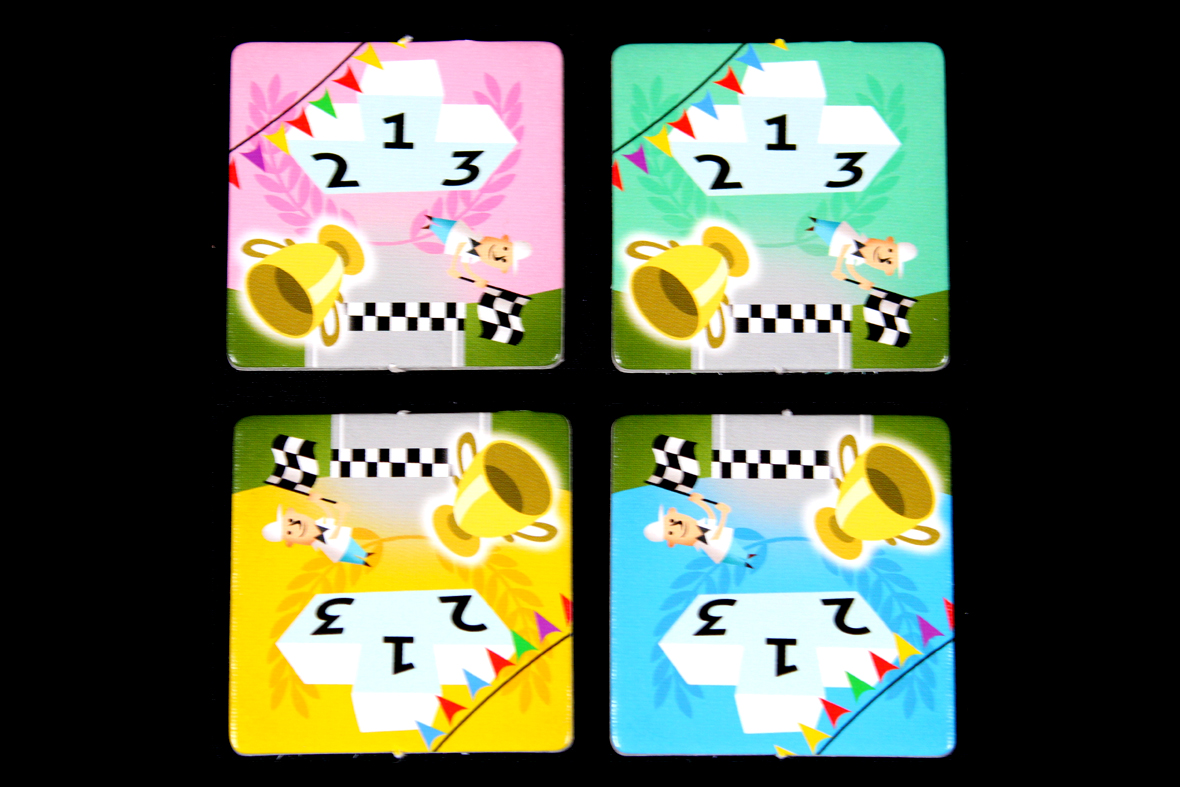 When you make it to the center “pit stop” tile, you must immediately take and reveal one of the face-down trophy tokens. The color of that token indicates the color of the start-finish space that you must return to in order to win.