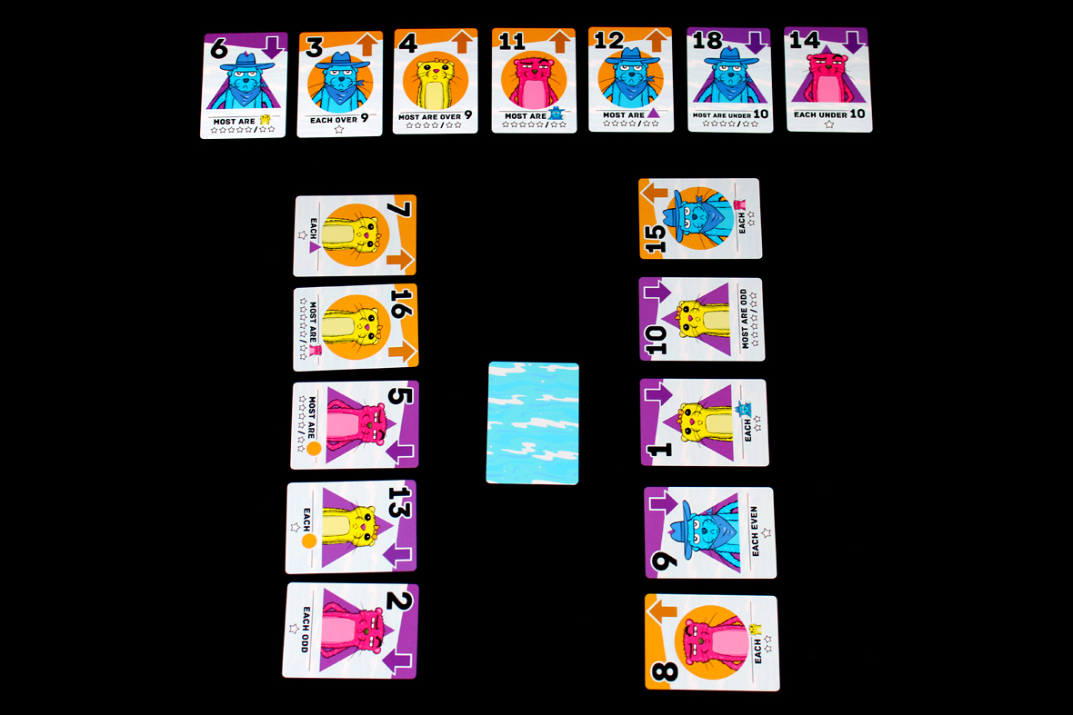 - If two cards in play have a purple triangle / down arrow on them, the lowest card played (other than the neutral card) wins this round.