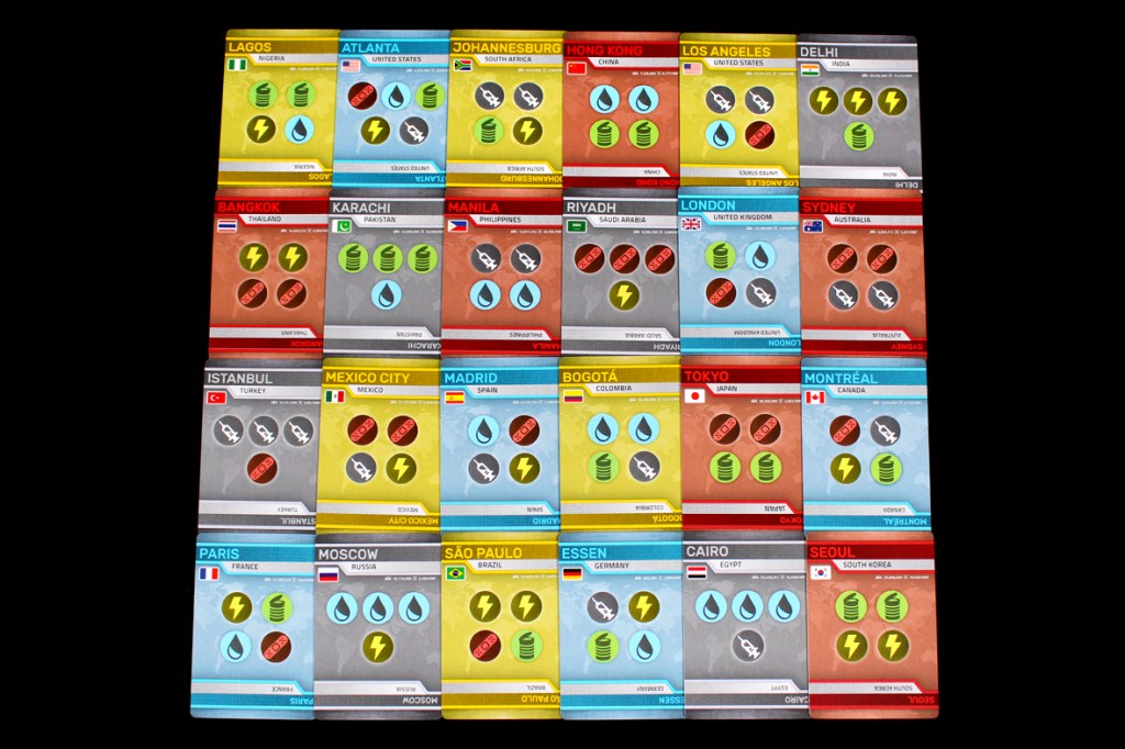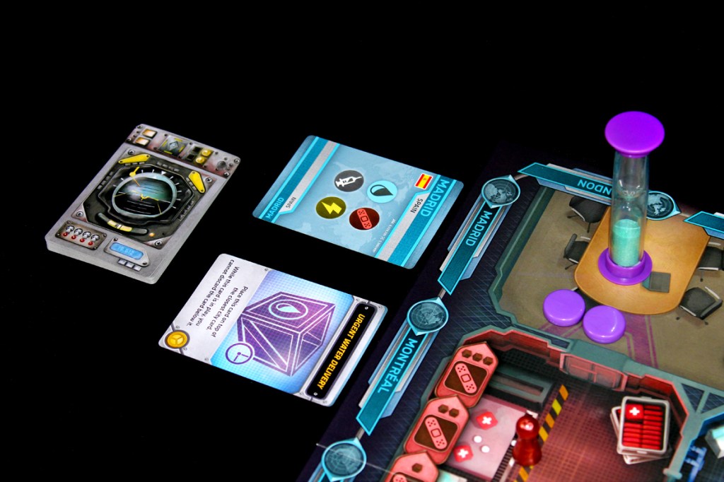A game of Pandemic: Rapid Response is played in real-time, as quickly as possible. I’d recommend reading this before you flip the timer, at least. Each turn, players work to make supply cubes to deliver to cities in crisis.