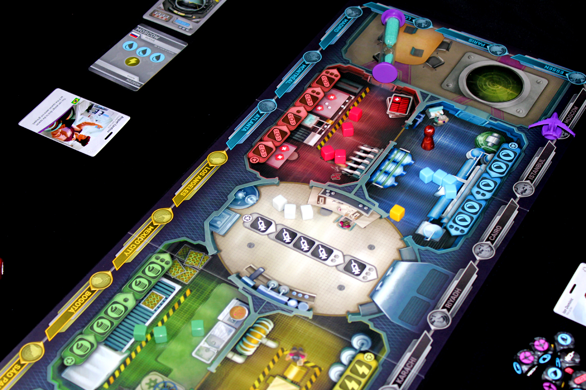 A game of Pandemic: Rapid Response is played in real-time, as quickly as possible. I’d recommend reading this before you flip the timer, at least. Each turn, players work to make supply cubes to deliver to cities in crisis.