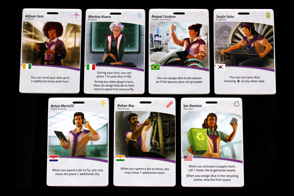 - Lots of great roles available for players. I’m a big fan of the Recycler, but that’s just me. I think the Role Cards do a good job of either boosting ordinary actions or letting you cut some corners. Extra rerolls, making certain faces wild; a lot of different moves are available, and many of them are helpful ways to move your team along. I’m so-so on the Flight Planner, though; getting two plane moves for one die face is nice, but there are other, more useful roles, I think.