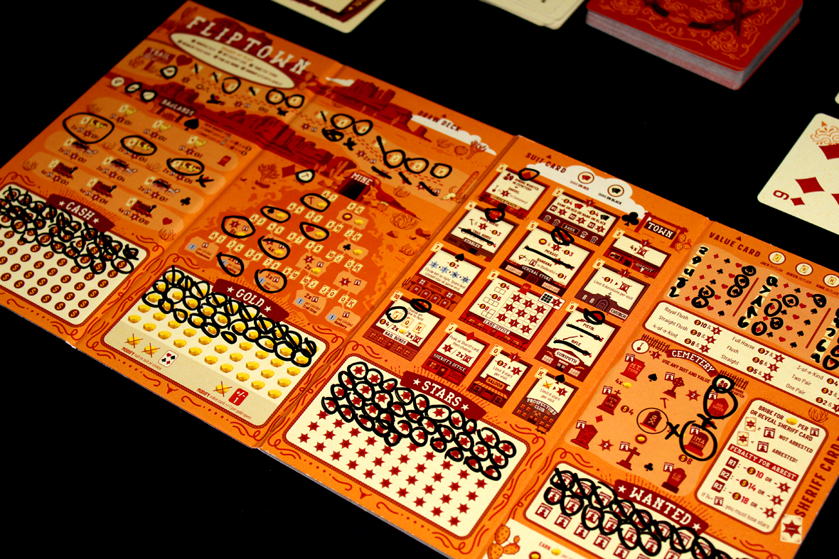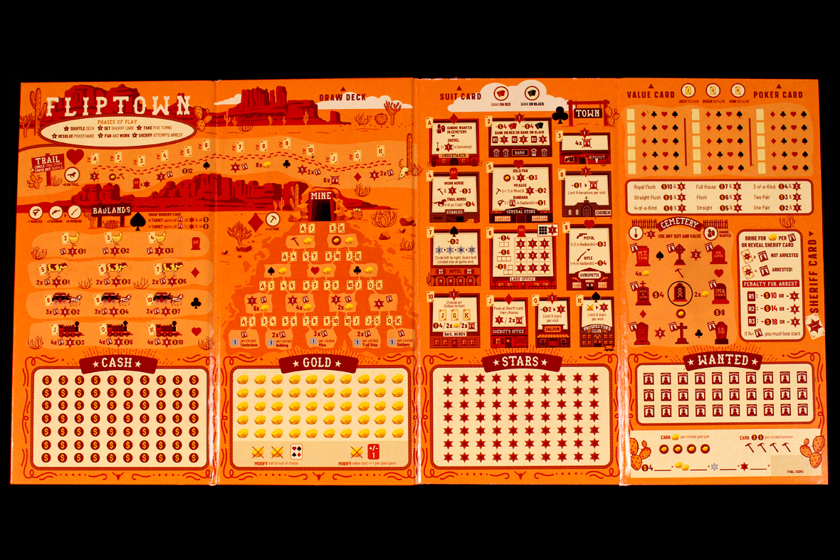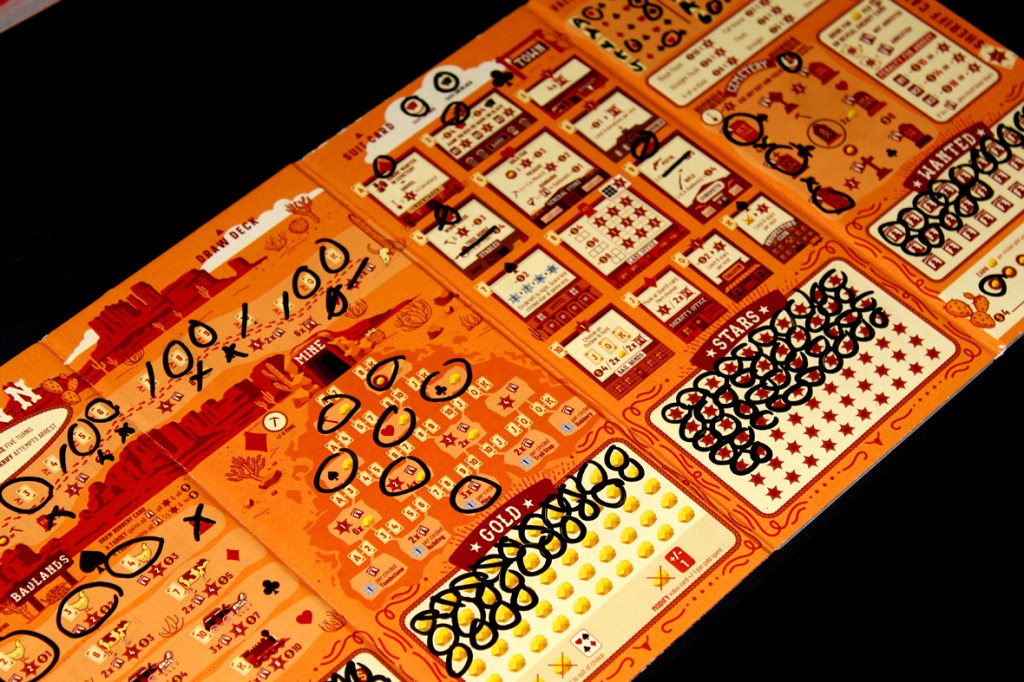Fliptown is a flip and write! This means, as is common to the genre, you’re going to be flipping cards and using the results to write on your handy board. Since it’s an old Western, you may want to keep one of the cards up your sleeve for an upcoming poker game each round!