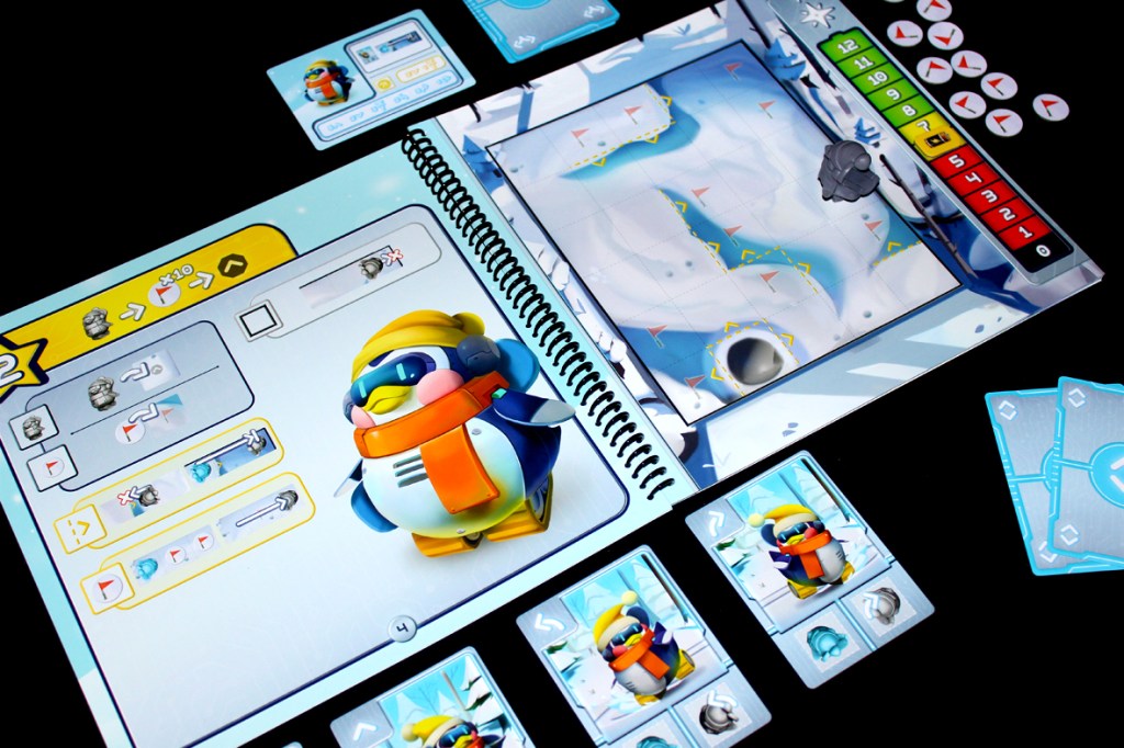 So, I covered most of how Quirky Circuits works in my initial review of the core game. The big change here is that along with Gizmo, our classic cat + robot vacuum dream team from the first game, we now have Penny, a new robot penguin friend who is a delight to behold. Penny’s major skill is that she can slide by moving either down a slope or by using slide cards to move in the same direction until she either hits an upward slope or an object. Her missions primarily revolve around navigating increasingly complex courses to collect flags before returning back to the starting point!