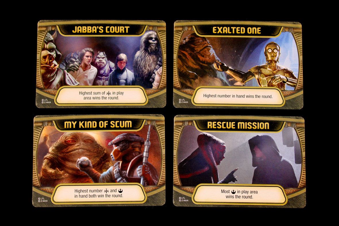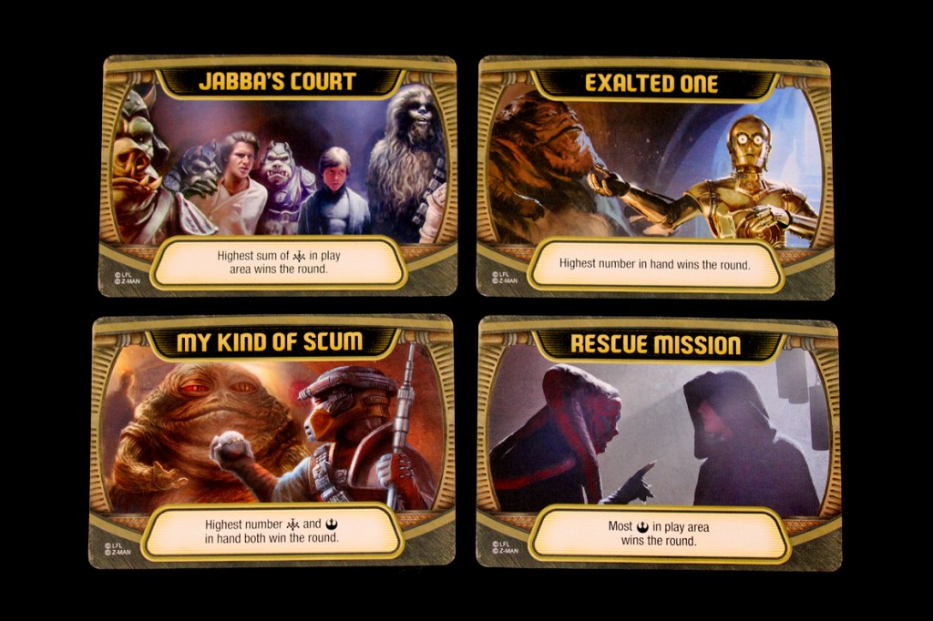 In Star Wars: Jabba’s Palace, the Rebels have infiltrated the headquarters of the crime lord Jabba the Hutt, ostensibly to recover Han Solo, frozen in Carbonite. However, the Palace has many secrets and many dangers beyond just a singular Hutt. Keep an eye out for the ever-changing Agendas, stay hidden, and you might be able to do better than survive: you might come out on top! Will you be able to get what you want from the palace?
