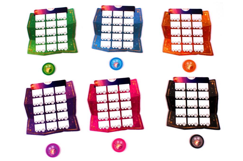 Give them markers and an eraser cloth as well. Also, give them a Lantern Token in the same color. One player should keep track of the score on the scoreboard: