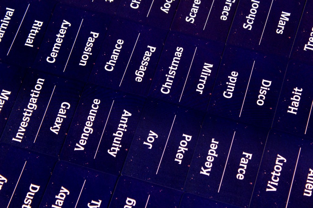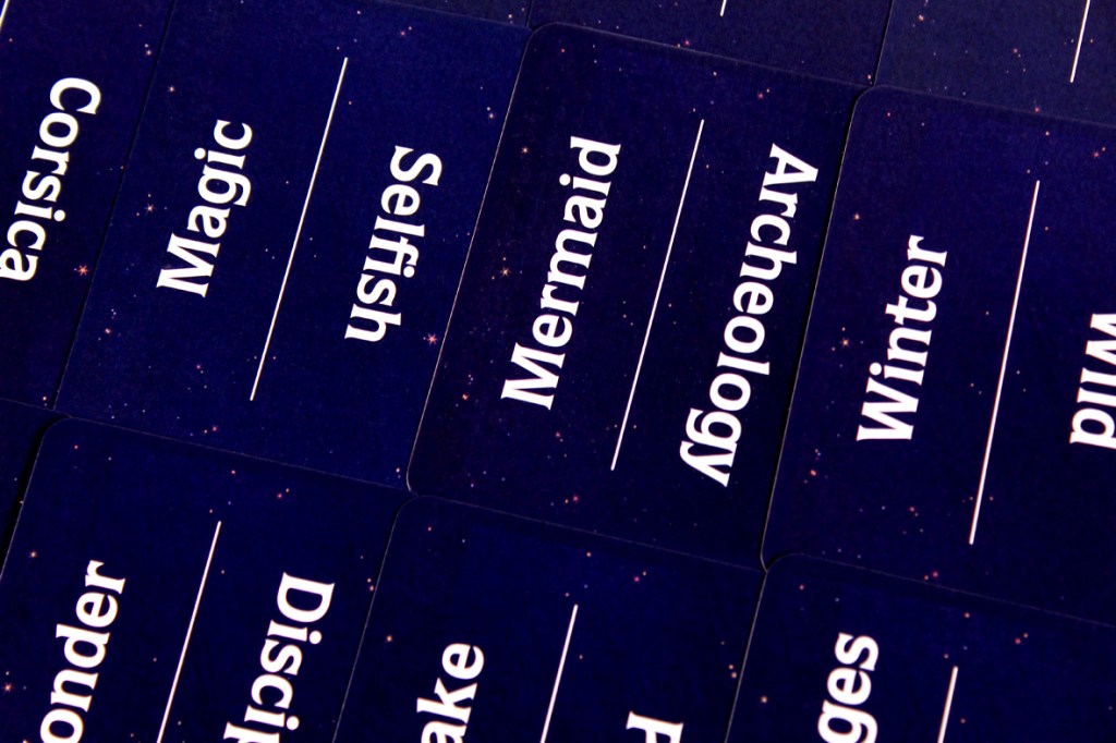 A game of Stella is a game of word association! Your goal is to find the most cards that everyone associates with the round’s Clue Word, over four rounds. Each round has the same phases, so let’s go through them.