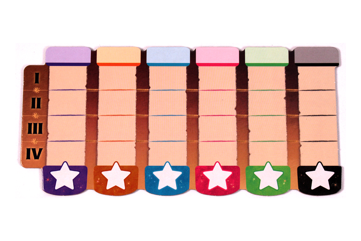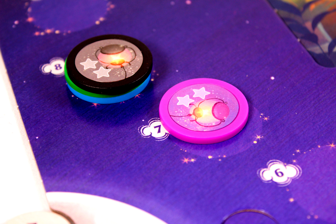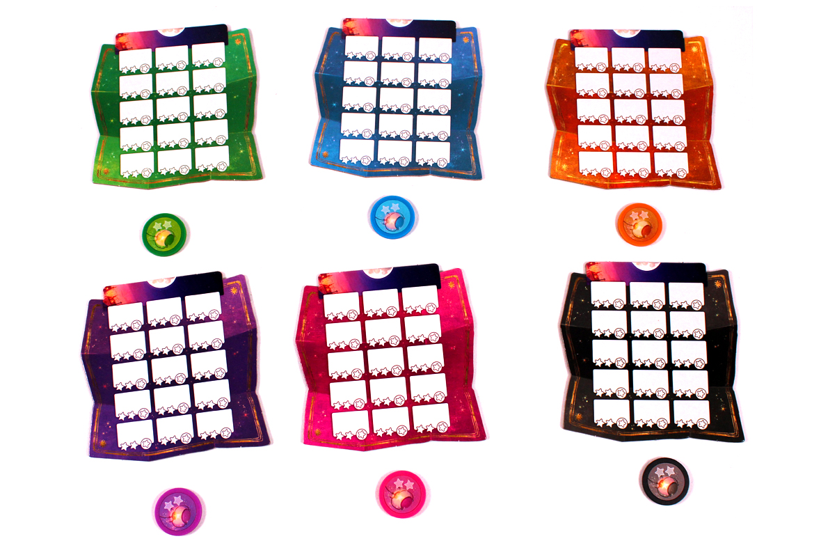 Give them markers and an eraser cloth as well. Also, give them a Lantern Token in the same color. One player should keep track of the score on the scoreboard: