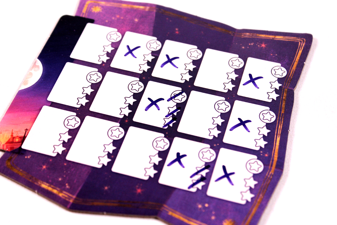Each player scores one point for each star that’s been filled in on their player board, with one exception! The player who went In the Dark scores normally if they never Fell; if they did Fall, they earn one fewer point on each Spark and Super-Spark (essentially, they earn one fewer point for each set of stars they filled in on their player board).