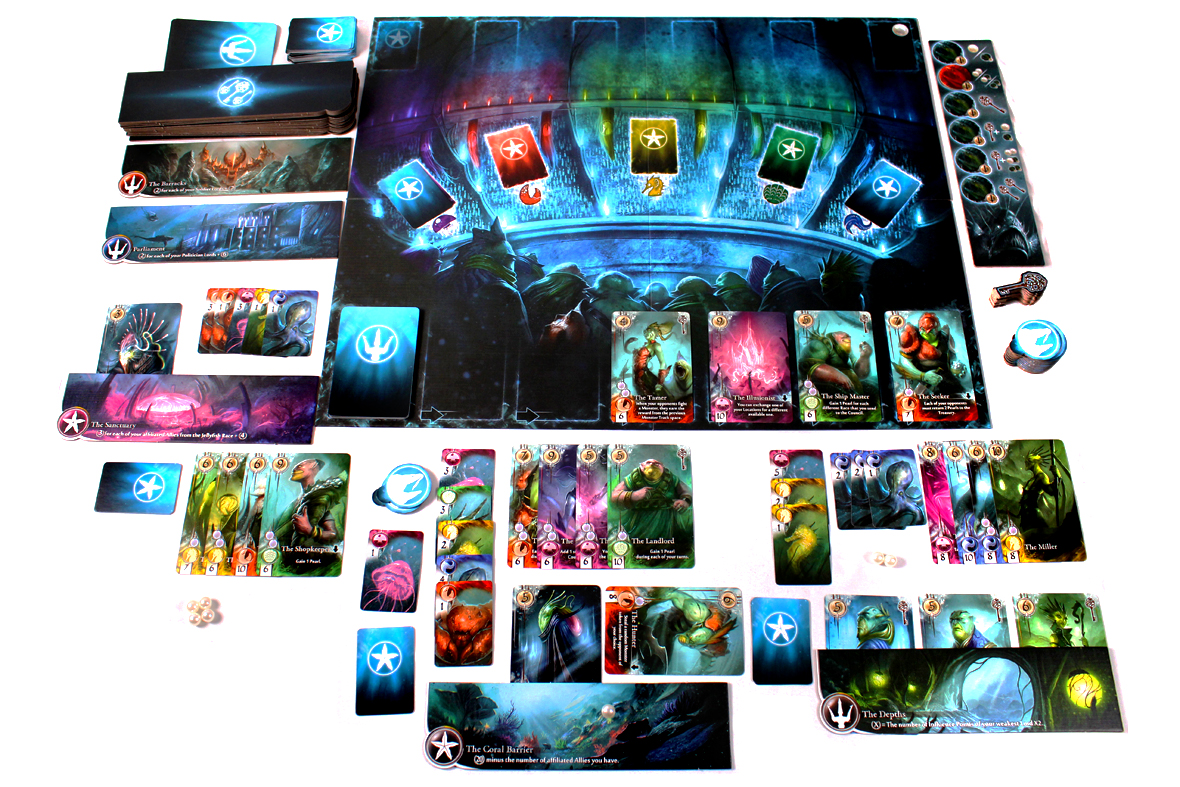 - This is probably one of the most visually striking games I’ve played, from cards to boards to components. It’s got a very particular art style, but I’d be lying if I didn’t note that it’s pretty impressive! Abyss has a very detailed and particular art style that just works for it. It evokes an entire world under the waves that is foreboding and sinister but still colorful, which I appreciate. It’s just a good-looking game.