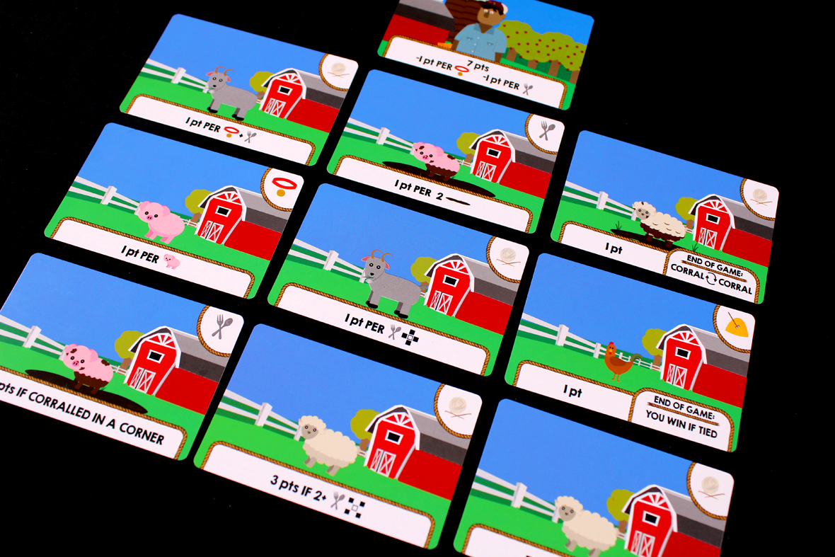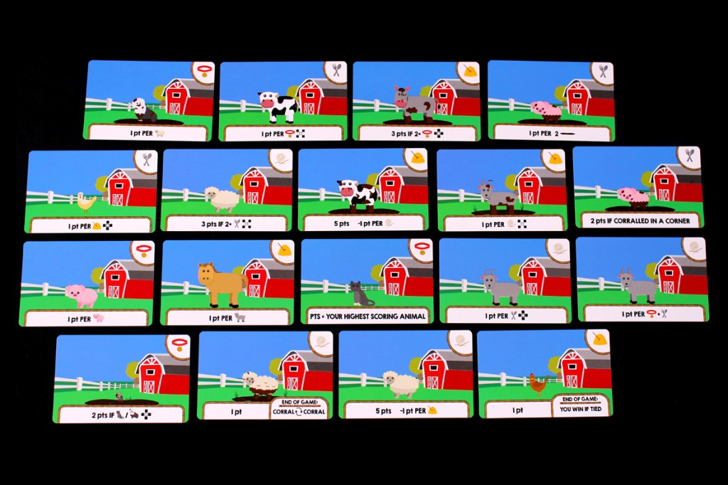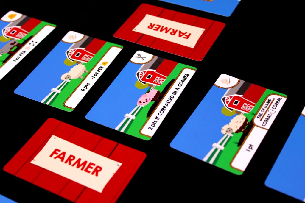 Once both players have a 3×3 corral, the game’s over! Activate any “End of Game” abilities, then total up your points (including your Farmer Cards, if applicable) and the player with more points wins!