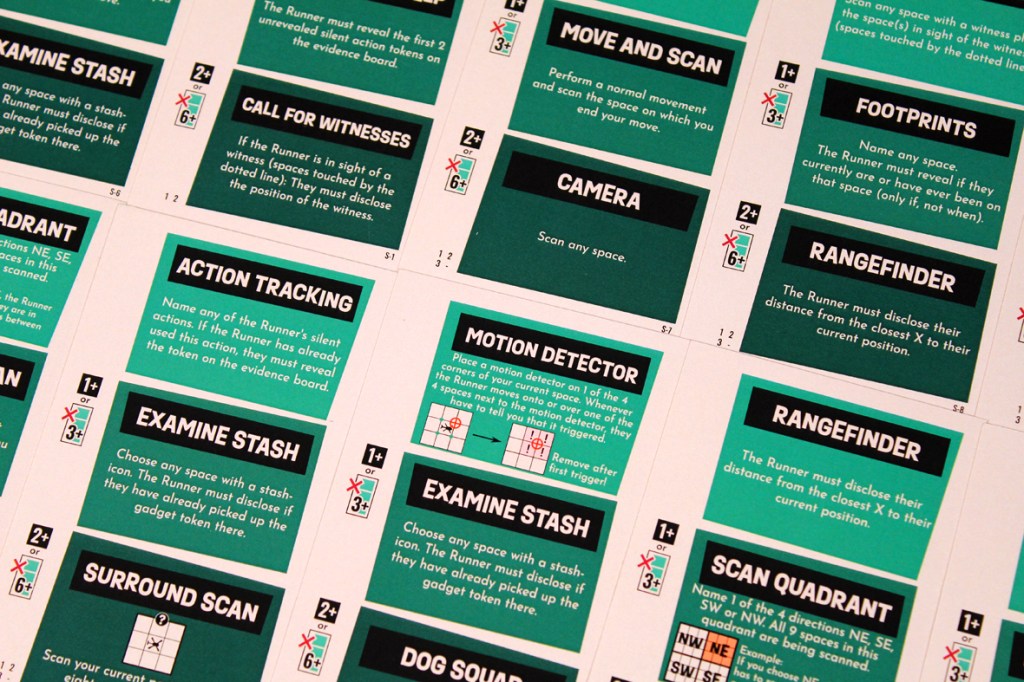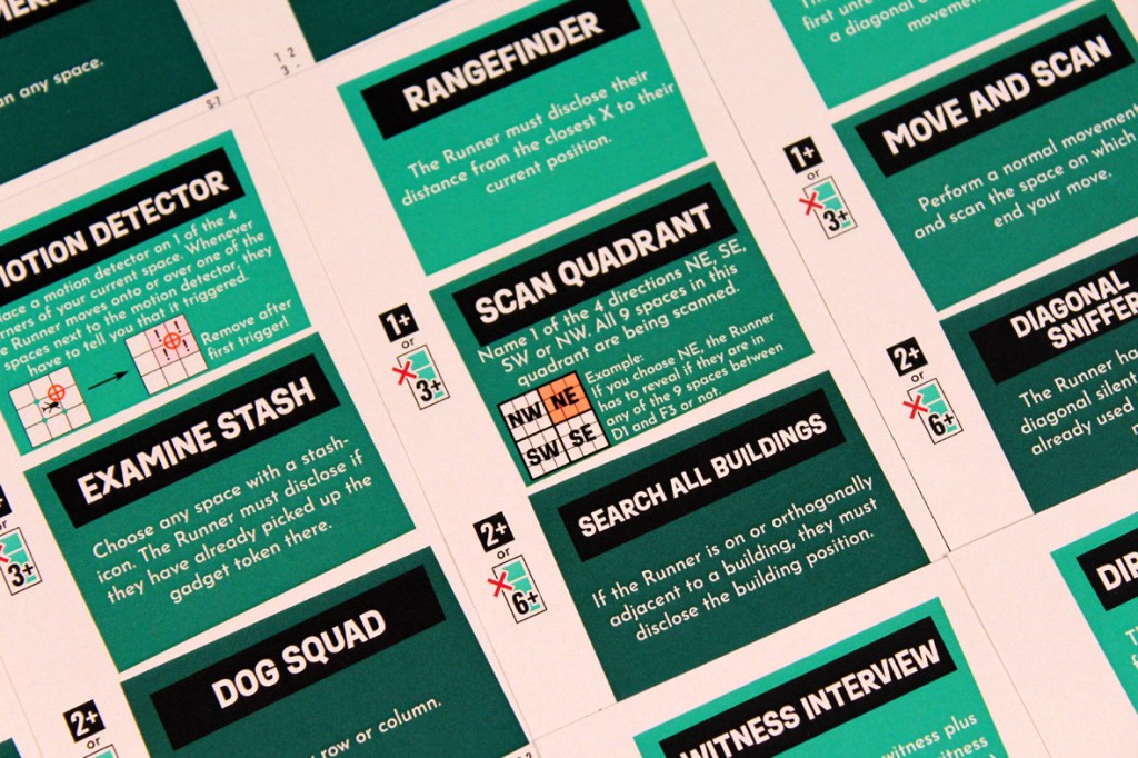 When Dispatch uses an action, the runner confirms if they are in the indication location(s). If not, the Dispatch player misses. This allows them to draw a Backup Card, which gives them a choice of abilities, based on how many Gadgets the Runner has activated (and how many Backup Cards have been used). These abilities can help locate the Runner, move Dispatch, or make it harder for the Runner to slip around unnoticed.
