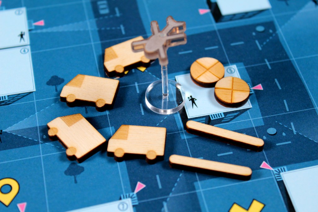 Next, the five action tiles are placed below the Dispatcher’s map: