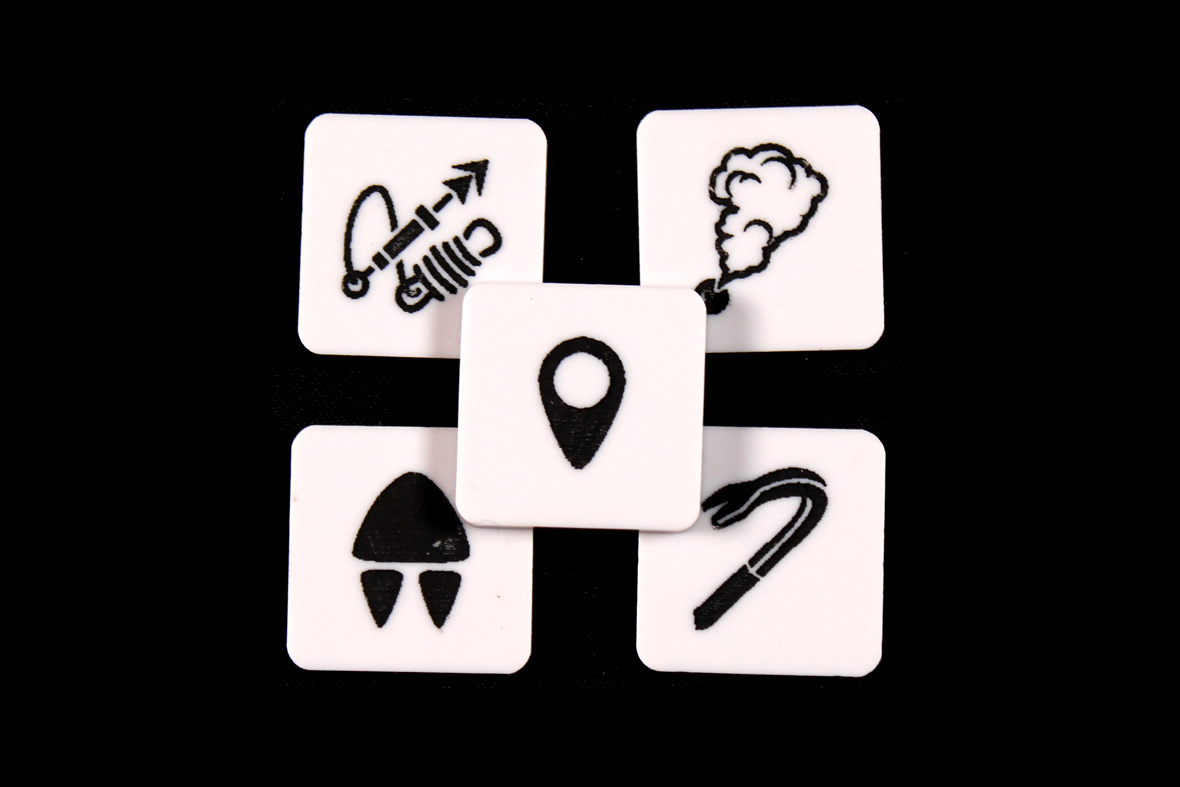 When taking an action, the Runner removes the Action from their board, flips it over, and places it in the first available slot in the Dispatch’s Evidence Board. Many actions are double-sided, but some have a “?” on the back, indicating that they are Silent Actions. When the Runner takes a Silent Action, Dispatch knows that the Runner took one, but not which! Some Loud Actions are Sprints, which allow the Runner to move one or more spaces in the indicated direction. They do not tell Dispatch how many spaces they’ve moved. Similarly, Jokers tell Dispatch that the Runner moved one space orthogonally or diagonally, but not which. The Runner figure tracks their location on their board.