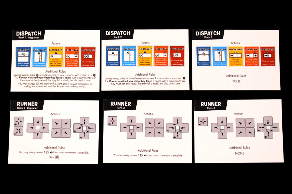 Then, take the Rank Cards for both roles, giving the Dispatcher their Rank Cards and the Runner theirs. Each player plays at Rank 1 for their first game. The Rank Cards may add additional setup rules or gameplay rules.