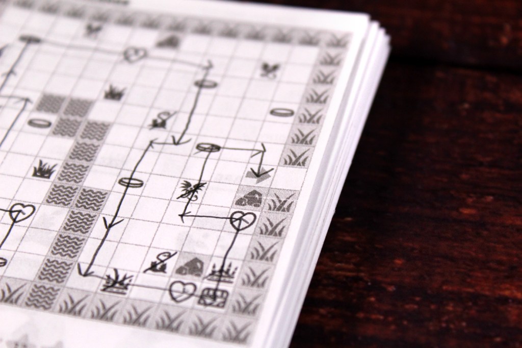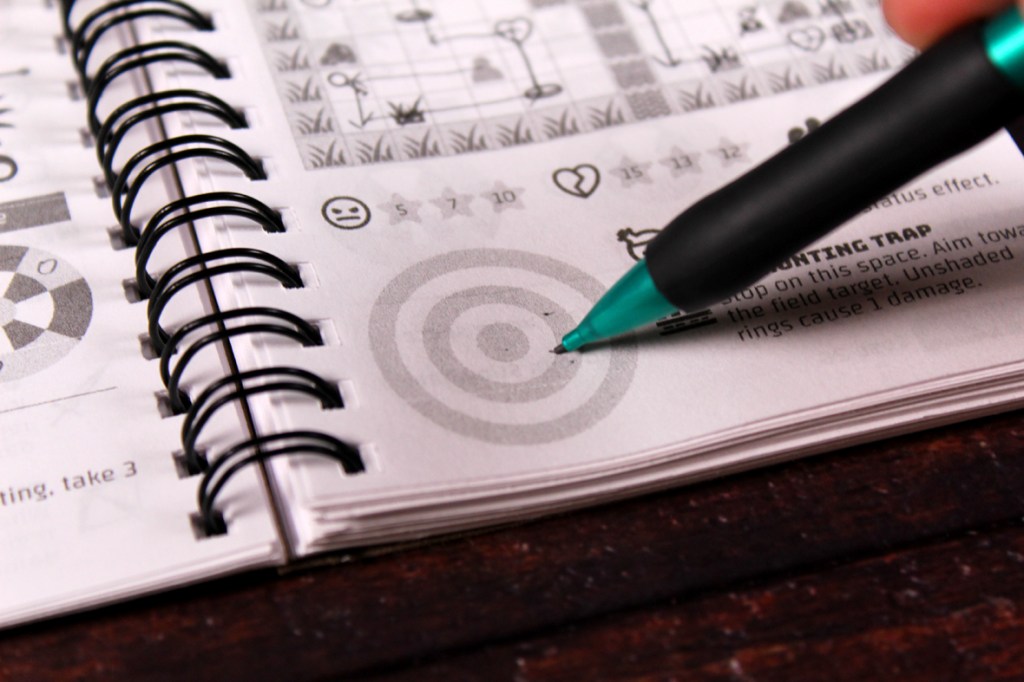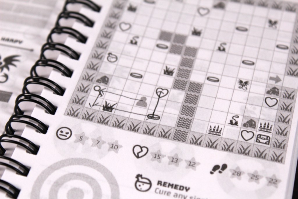 Overall, I found Pocket Book Adventures to be a delightful and novel experience! I was a bit worried, at first, because I’m not wholly into dungeon-crawlers as a genre. Too much combat for me, generally, and not always enough of an emphasis on the exploring part. It’s why I like Betrayal at House on the Hill; the combat is wild and the exploration is a major component of gameplay. But, critically, I think Pocket Book Adventures has captured something pretty special with a simple design: a very leisurely dungeon-crawl experience. You can pop in for a bit, do a couple levels, and keep going, always keeping track with your current page without much effort. I love that! It feels like a dungeon crawler for busy people, and I’m busy people! What really sold me on the game, though, was the dexterity-based, one shot approach to combat. Fighting’s no longer a tedious slog (except for the occasional enemy that can revive); instead, it’s a quick-but-challenging dexterity challenge to give you some of the thrill of randomness while still keeping the game quick and snappy. I was impressed by that! The one thing that complicates the game’s speed-based approach to everything is that it does take a little bit of time to update your next sheet with your previous information, especially if you want to keep track of what your weapons do, but as far as complaints go, that’s not too minor. I would have preferred a more colorful version of the game beyond just the grayscale reminding me of the Dragon Quest games of my youth (Dragon Warrior, at the time), but everyone’s got their preferences. I’ll say, though, that I went in a bit skeptical and left impressed, so that earns pretty solid marks, from me. If you’re looking for a small-but-mighty solo title, you’re into dungeon crawling but you don’t have a ton of time, or you’re looking for an interesting dexterity challenge, I’d recommend checking Pocket Book Adventures out! It’s a neat one.