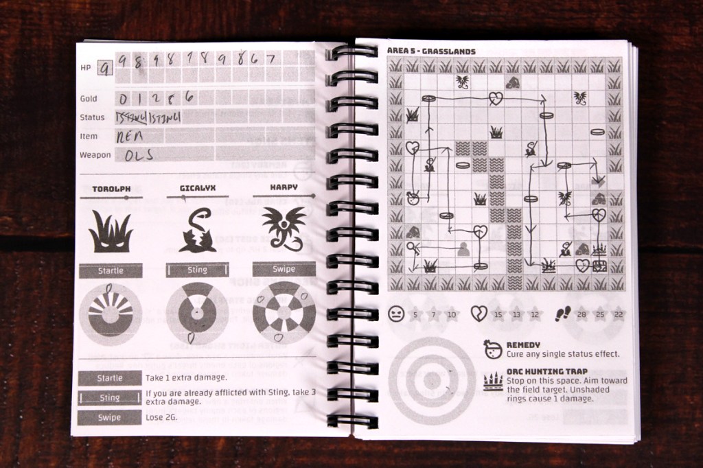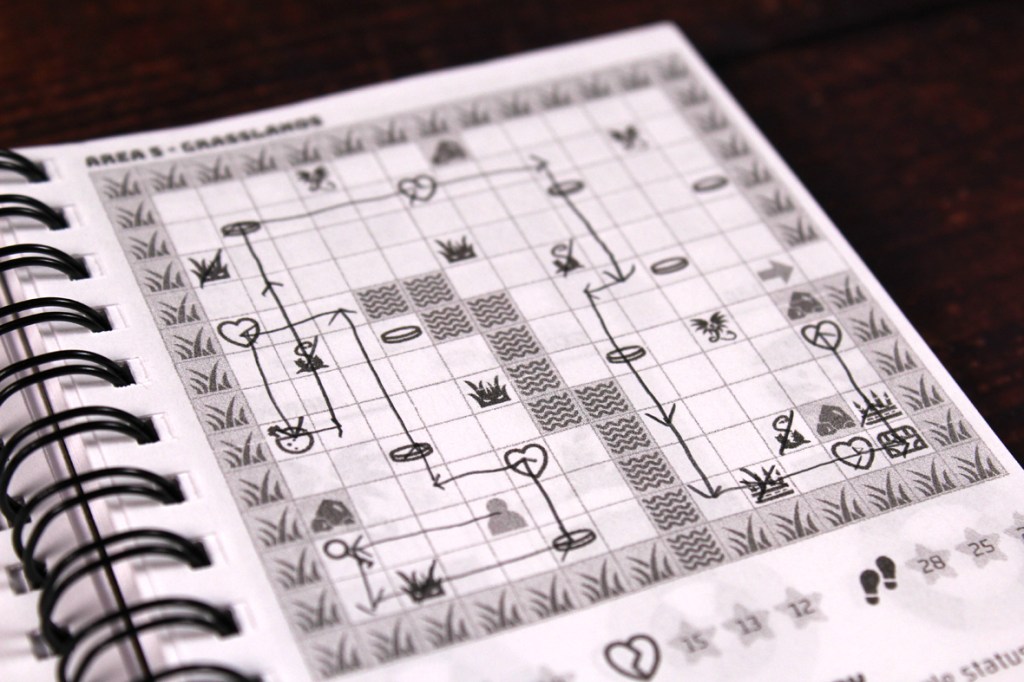 - I can totally see the reasoning behind everything being grayscale, but I do like a game with some color, so that’s a bit of a disappointment. I just think a little bit of color would really pop, whereas the grayscale doesn’t, as much. The pages don’t quite look samey (changes in terrain and monsters help a lot with that), but I’d love to see what a more colorful version would have looked like.