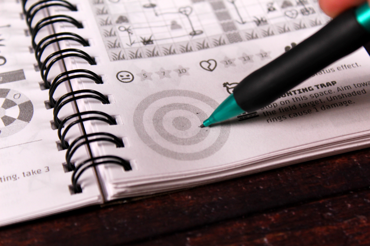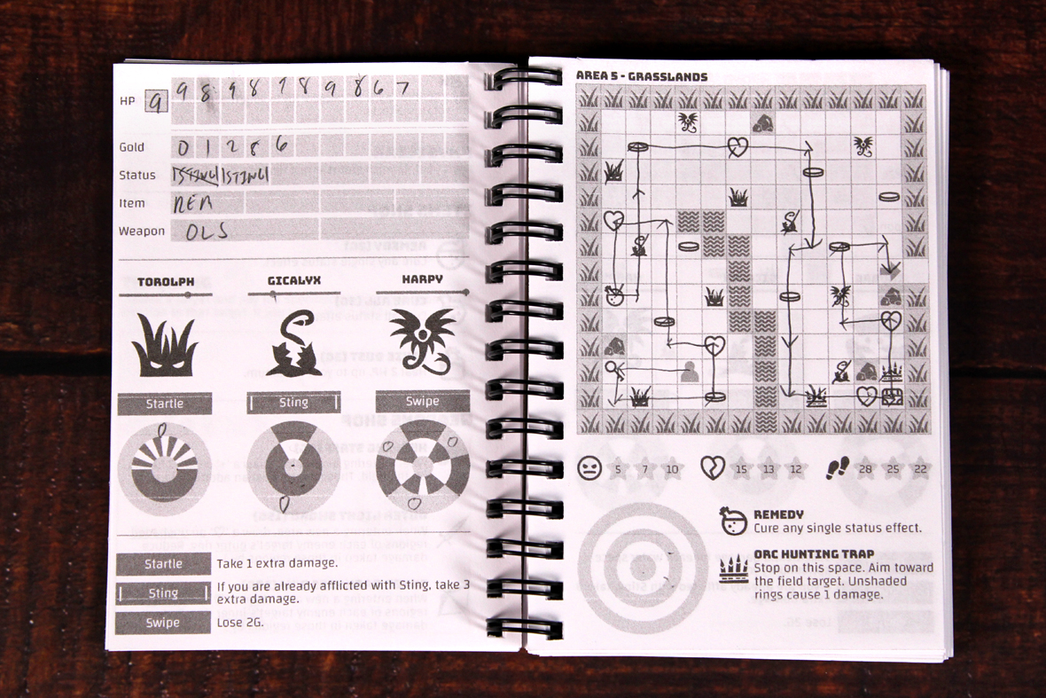 Should you end your movement on one of the eight spaces around a monster (or on the monster’s space, as living monsters block your movement), the monster attacks! This is where a major concept, aiming, comes into play. On the left sheet, each monster type is pictured, along with a bar above it and a target below. To fight the monster, you’ll place your pencil onto the dot on the bar above the monster and then, without looking, try to move the pencil to the center of the target below the monster. If you land in the outer ring, take two damage. If you land in the inner ring, take one damage. If you land in the center bulls-eye, you take no damage. Some monsters have abilities which activate if you land in the shaded areas, so if you do, activate that ability. Long-term abilites are denoted | like this |, so you can tell which ones affect you for a while, yet. Either way, the enemy dies unless your HP drops to 0. Then, you’ve been killed.