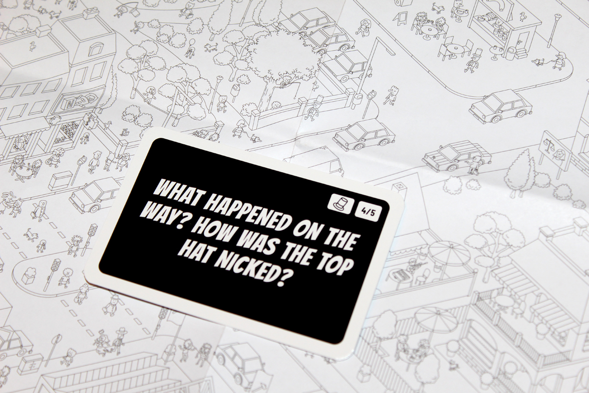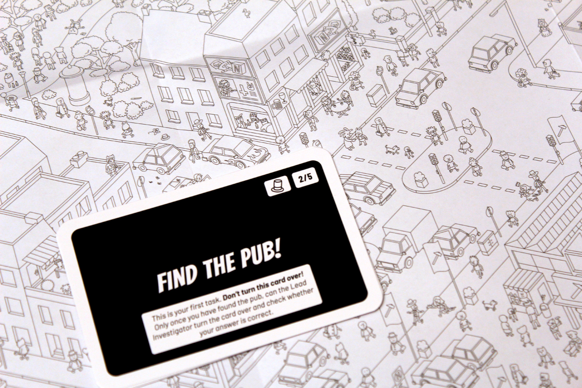 To start, the Lead Player reads the back of the first card; that tells you some brief setup and gives you someone to look for. Then, you’ll have a question on a black card below it. To answer that question, you have to find it somewhere on the board and be able to provide the coordinates (for instance, A3 or F1). Don’t guess! You need to be able to prove it.