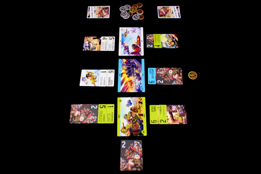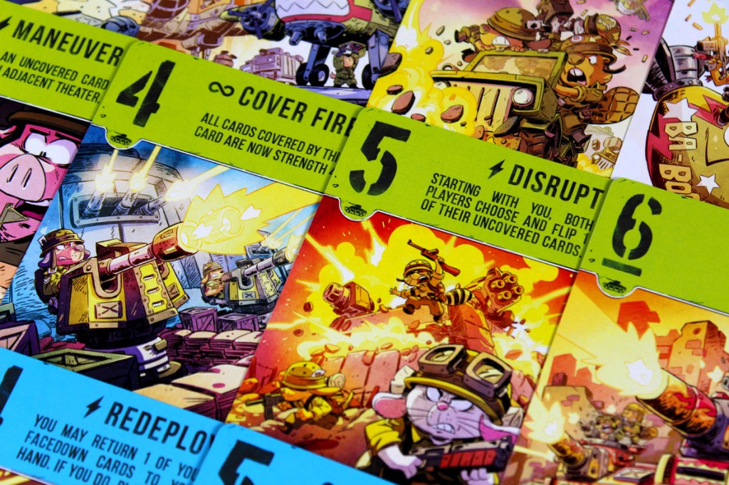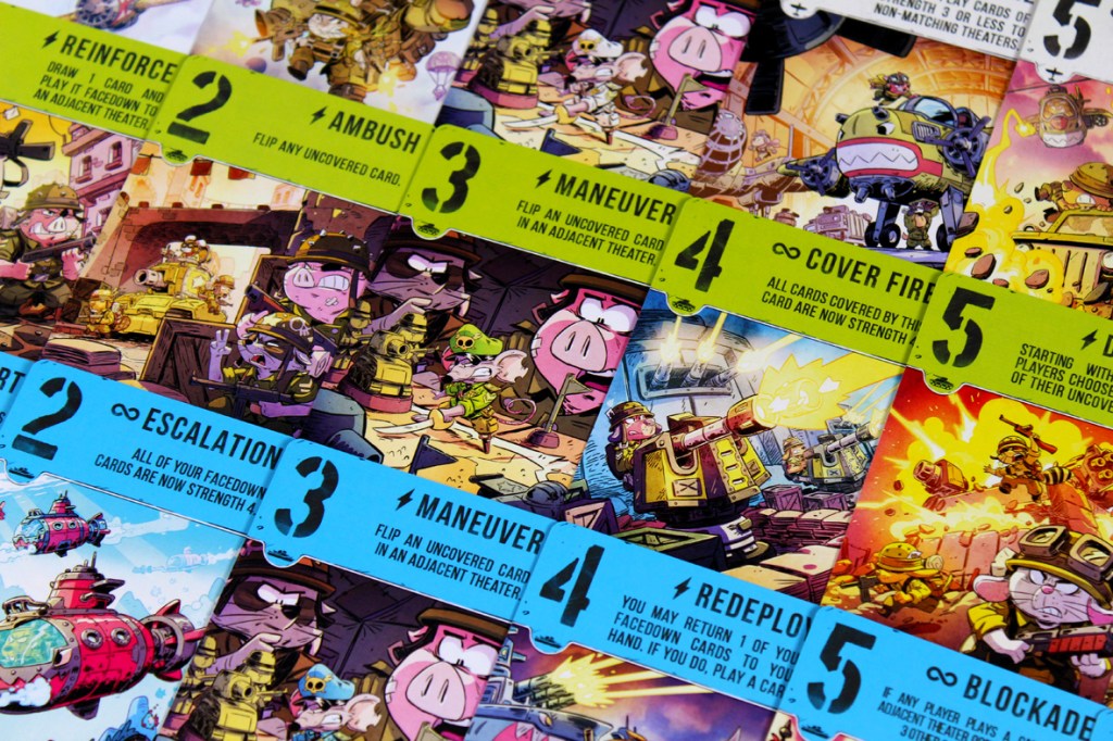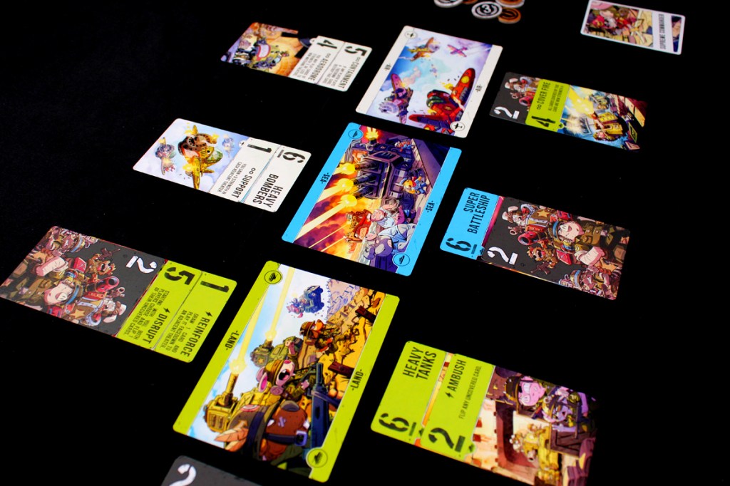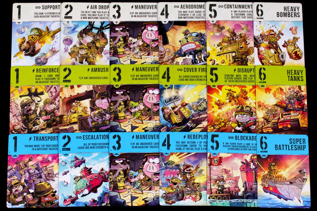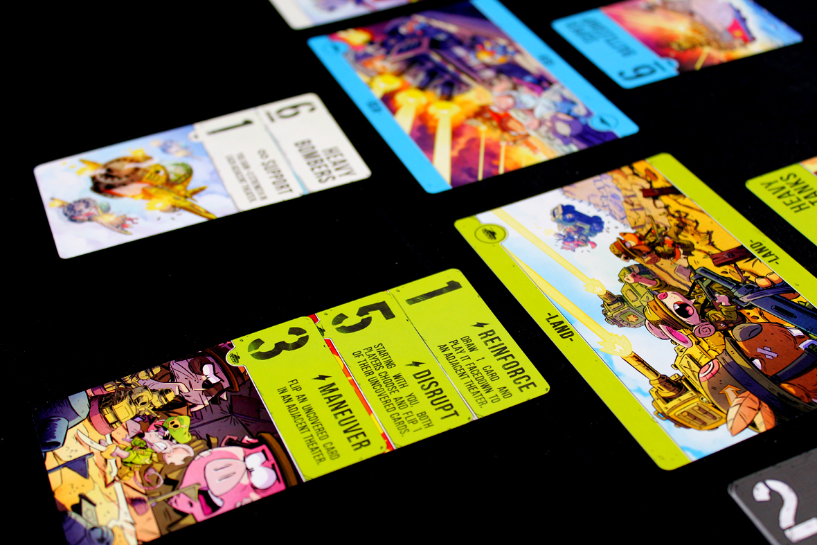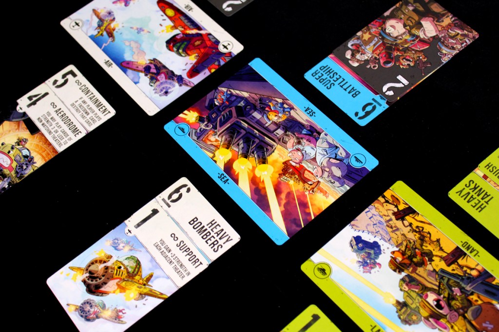 This one’s surprisingly simple. Over several rounds (“battles”), players will play cards to each theater, trying to either control the theater with a higher total Strength or by convincing their opponent to withdraw from the battle. A battle’s victor earns, predictably, Victory Points, and the first player to hit 12 or more Victory Points wins.