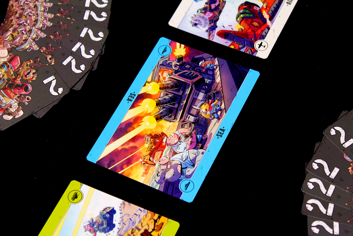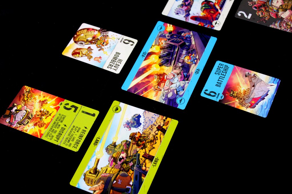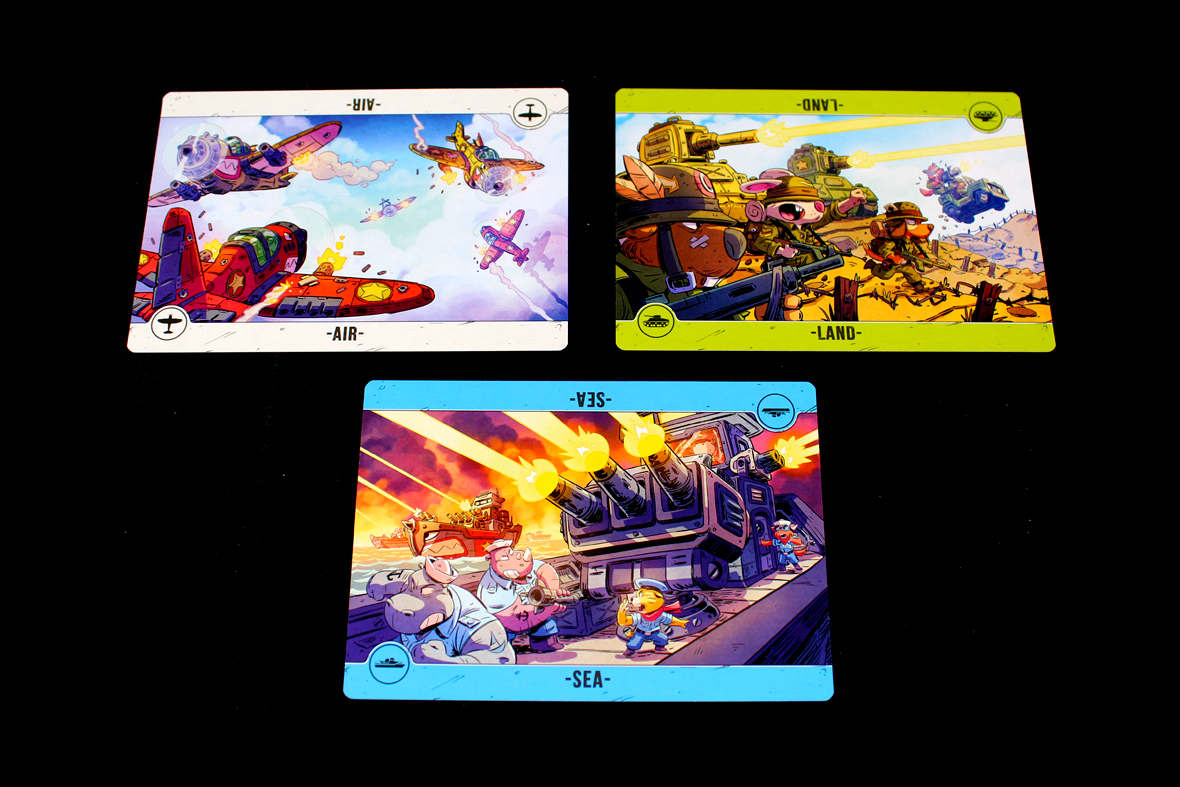 - I do appreciate the move to retheme this with animals and more vivid colors. I’m sure the original game is nice, but this is a fun retheme that draws me in a lot more. I don’t think I would have been particularly motivated to try the original Air, Land, and Sea (or, more aptly, I would have confused it with Heroes of Land, Air, and Sea, which is precisely what I did). I’m not sure “animals at war” makes the game more inherently approachable, but it does catch the eye (and sit on the table) a bit better, which works for me.