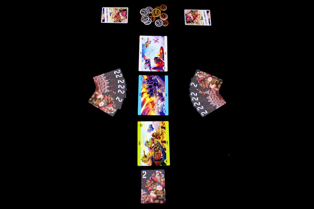 - Having the backs of cards be worth 2 Strength is interesting; it adds some strategy to which cards get flipped when (and how much you should care about it). Sometimes that can be a strategic advantage (or, entertainingly, there are cards that reward players for having flipped-down cards). It’s an extra layer of strategic play that speaks to a thoughtful design. Plus, it’s better than having cards get discarded or removed; for one, it allows those options as subsequent (and more severe) penalties, and two, it lets players with flipped-down cards still stay strategically in play. I like it a lot, actually.