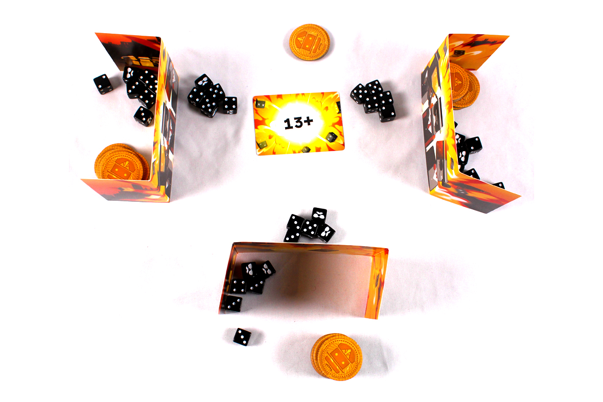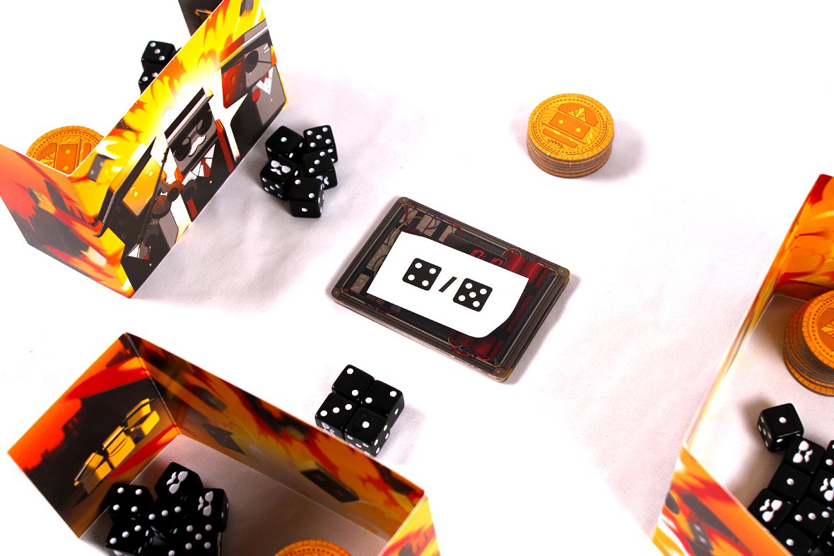 To start a round, reveal the top card of the Warning Deck. This shows the combination of dice that leads to a bust. In the final three rounds, you’ll also place 1 / 2 / 3 Gang Tokens on top of the Warning Card as a bonus to the victor.