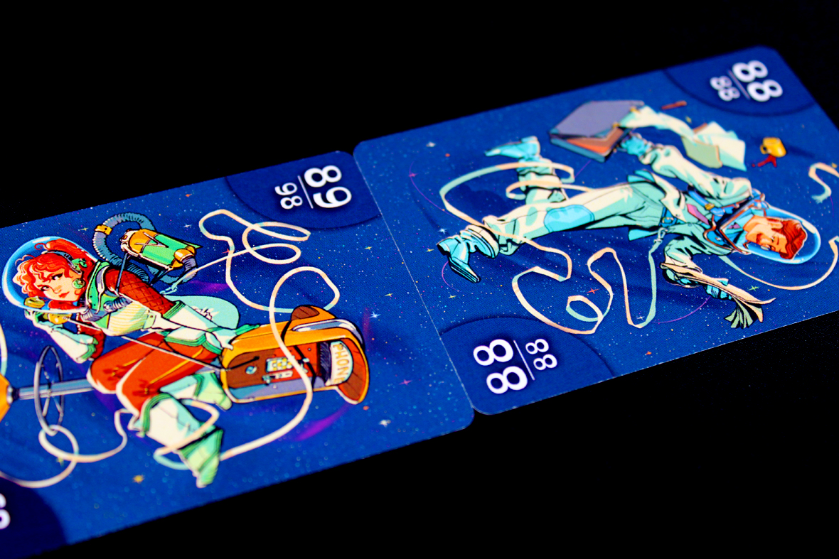 Overall, I was pleasantly surprised by Tether! It’s always difficult to know what to expect from a little deck of cards (though I suppose I should have known better, having been a fan of Mark McGee’s Kintsugi). Here, though, there’s a nice little bit of strategy and tactics in a very pleasant package. I particularly like the art style of the game; it’s a bit retro, which is always a fun aesthetic, but it’s bold, colorful, and engaging. The game itself is no slouch, as well. It’s a great proof-of-concept on how mirror decks can be used to make a compelling gameplay experience, especially when the game is pretty tight and compact on its own. Tether’s main advantages are that it’s dead simple to teach, easy to score, and a cinch to replay, which does give it that nice “let’s go again” feeling that you get after playing a game that you genuinely enjoyed. For some players, they might find that Tether runs a bit short or that the luck of drawing the right card can sometimes swing the game for their opponents. To them, I usually just say: play again! It’s so easy to, and at its core, Tether is just a nice, fun experience. Small, portable, and tight (even if it’s taking up a lot of table space, depending on how you play); it’s not a bad combination. If you’re looking for a nice two-player game, you enjoy a space game, or you just want to try out a mirror deck, I’d recommend Tether! I’ve been enjoying playing it.