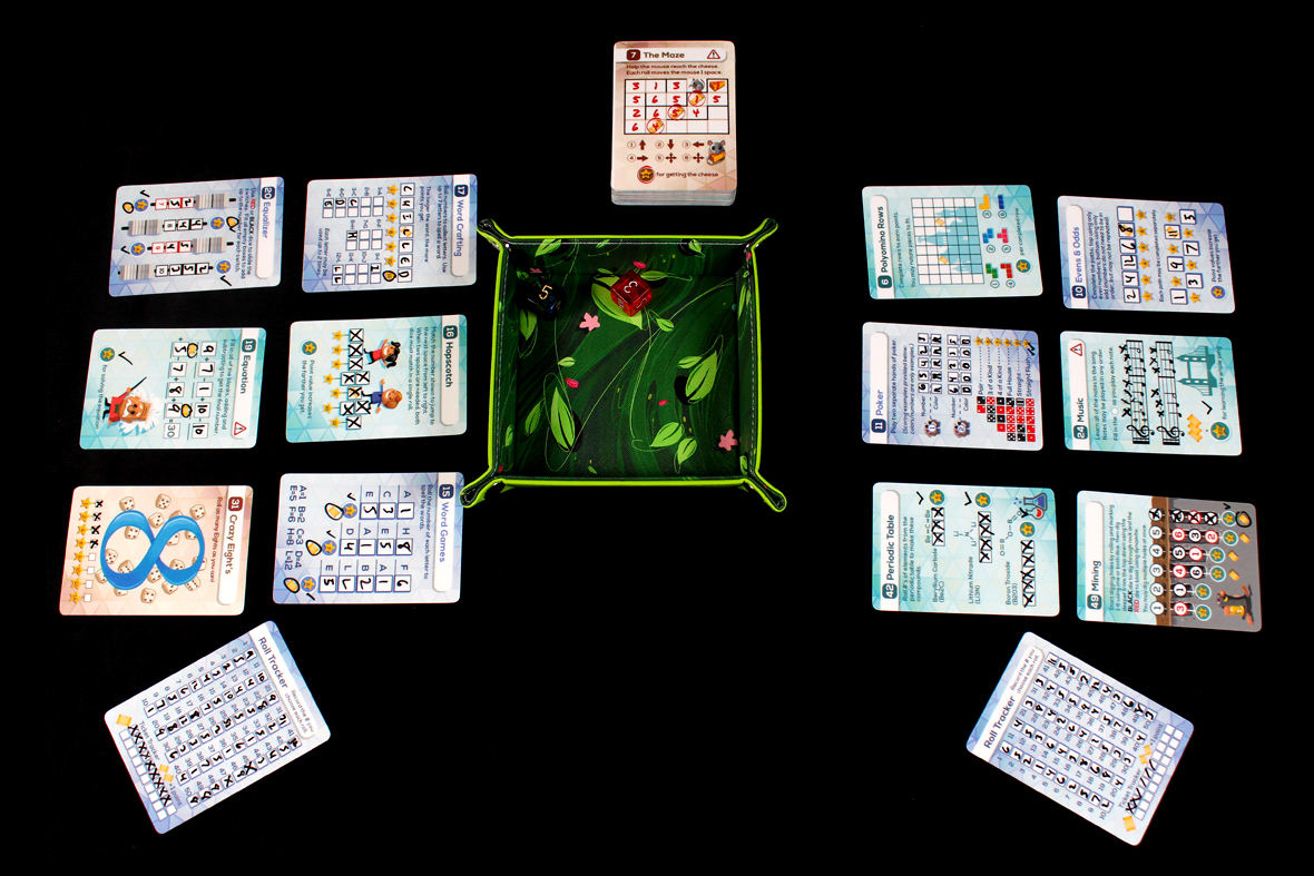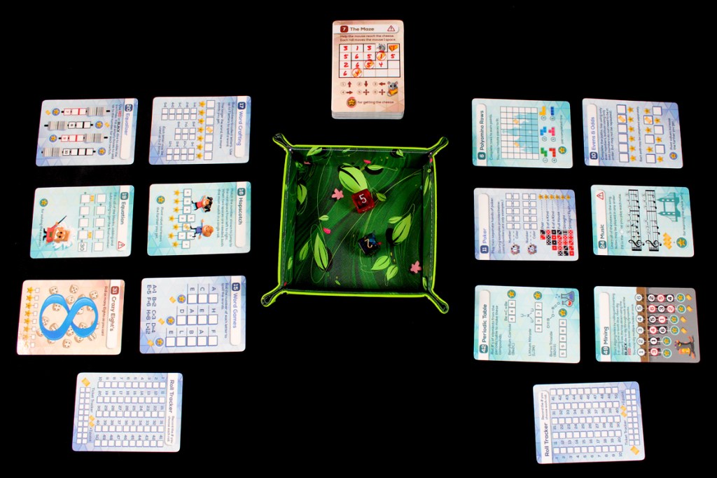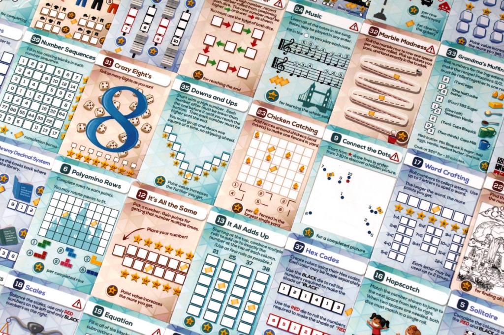 Dice Cards is a modular roll-and-write where each card is a unique mini-game! Roll two dice, use either number or the sum, and try to complete cards in order to score big points! Score tickets as well to modify your rolls and try to get more points than your opponents!