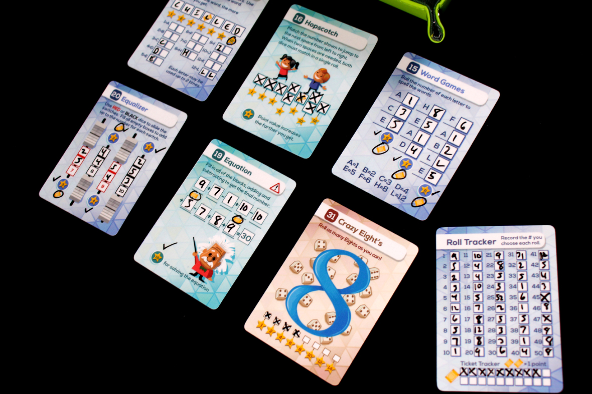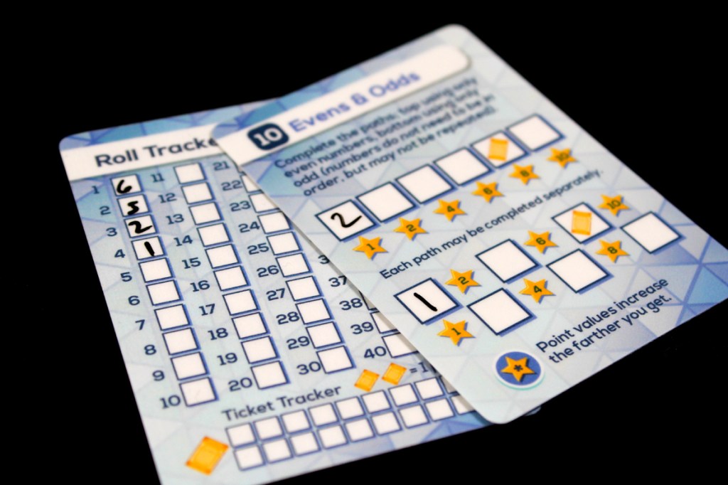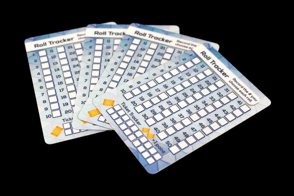 Either way, record the value chosen on your Roll Tracker (if recording more than one number, just do the best you can). As you complete some cards or fill in some squares on your mini-games, you may earn Tickets! Record those on your Roll Tracker, as well. You may spend Tickets on your turn to increase or decrease the value of any die (maximum of six and minimum of one, of course). You spending Tickets does not affect other players, however.