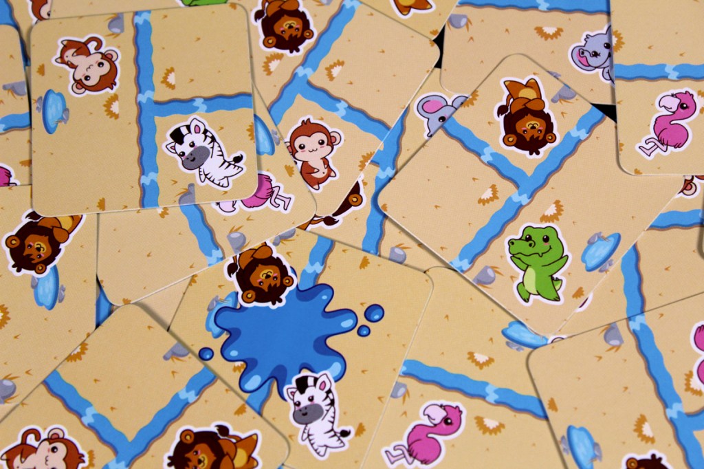 Overall, I think Safari Splash! is awesome! I was extremely pleasantly surprised when I first played it. Not that I tend to take a game’s length as my primary motivator, but I was confused by a game that only lasts 90 seconds, you know? That said, there’s a lot here, especially as a family-weight game. It’s a quick game of essentially pattern-matching, but you can only match patterns along the river you’re building, so you have to be smart about how you create that river flow. Additional difficulty levels make the game’s scoring more complex, so you can play a simpler version with newer games and grow the complexity with them (or just launch right into the highest difficulty with your work friend; your call). Thankfully, the cuteness of the game isn’t deceptive; it’s a very pleasant experience throughout. Probably not much in the way of player interaction, though; the usual interaction is that you’re all pulling cards from the same center area, and the only other interaction is passing cards around when a Splash! card is drawn. I tend to prefer that sort of thing, though. I like my river like I like the rest of my play areas; undisturbed by other, messy players. But yeah, path-building is one of my all-time favorite mechanics, so a short game with great art and mechanics I love? Easy sell, for me. If you’re looking for a path-building game for the whole family, you love cute animals, or you just want to play a very fast game at game night, I’d definitely recommend Safari Splash! I think it’s fantastic.