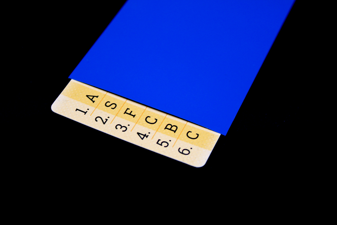 Slide the Password Card into the sleeve so that the numbers are poking out and then pass the sleeved card face-down to the player on your left. Nobody should look at the card they’re receiving.