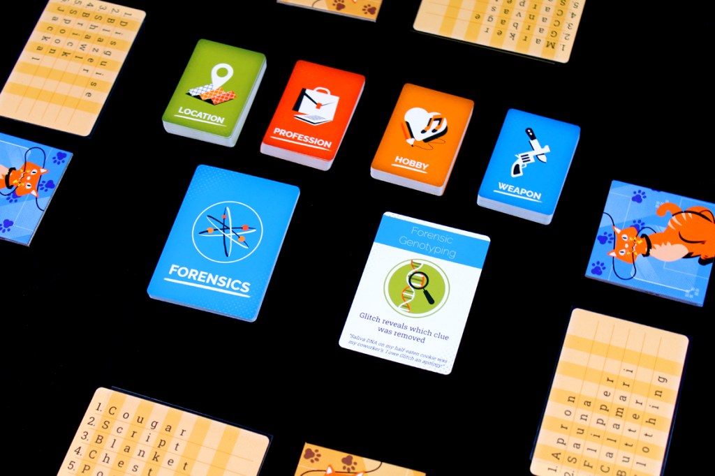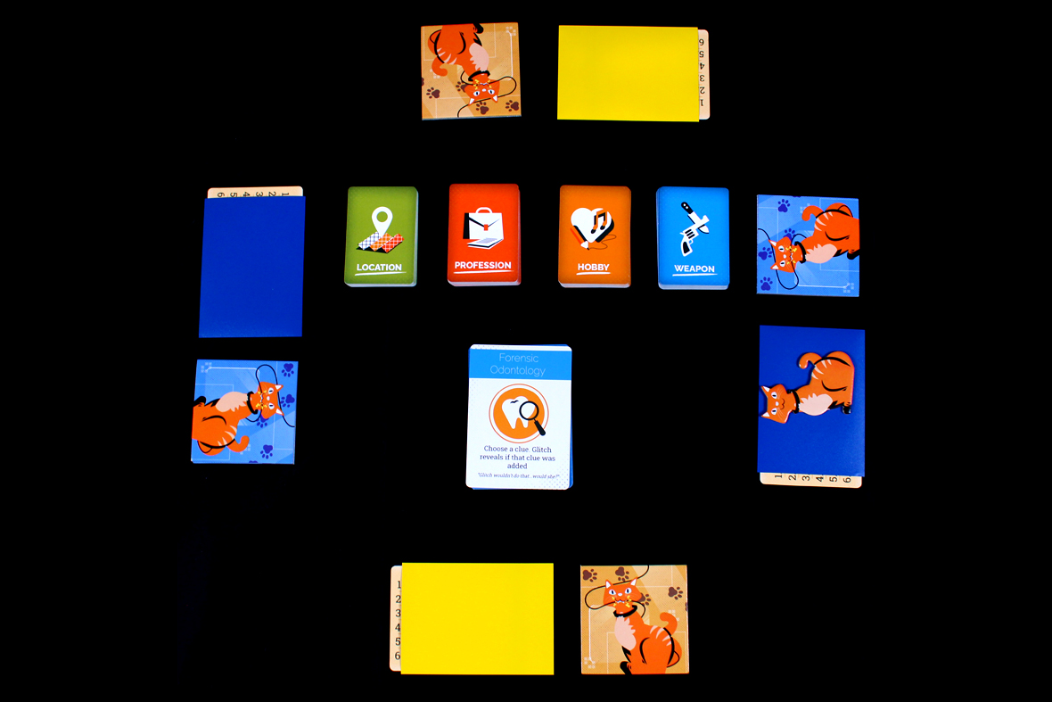 After this, discard the Evidence Cards, flip over the next Forensics Card, pass the Glitch token to the left, and erase all the Clue Boards; you’re ready for the next round!