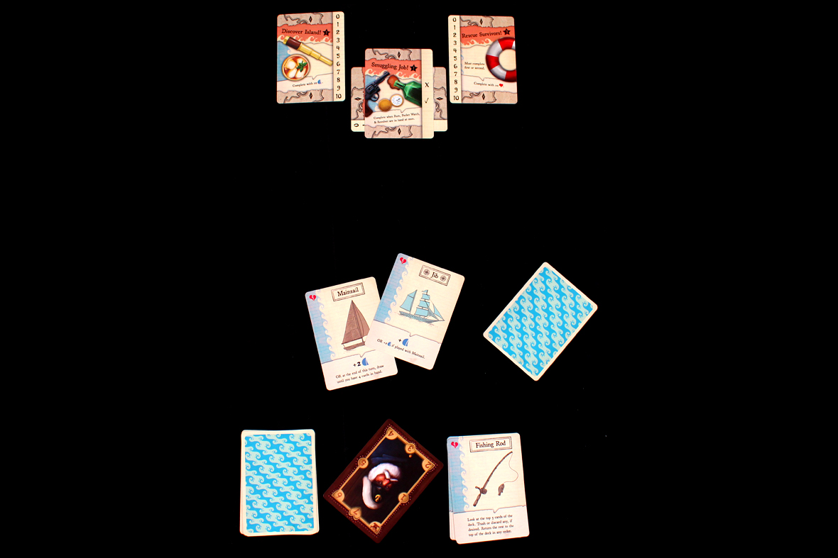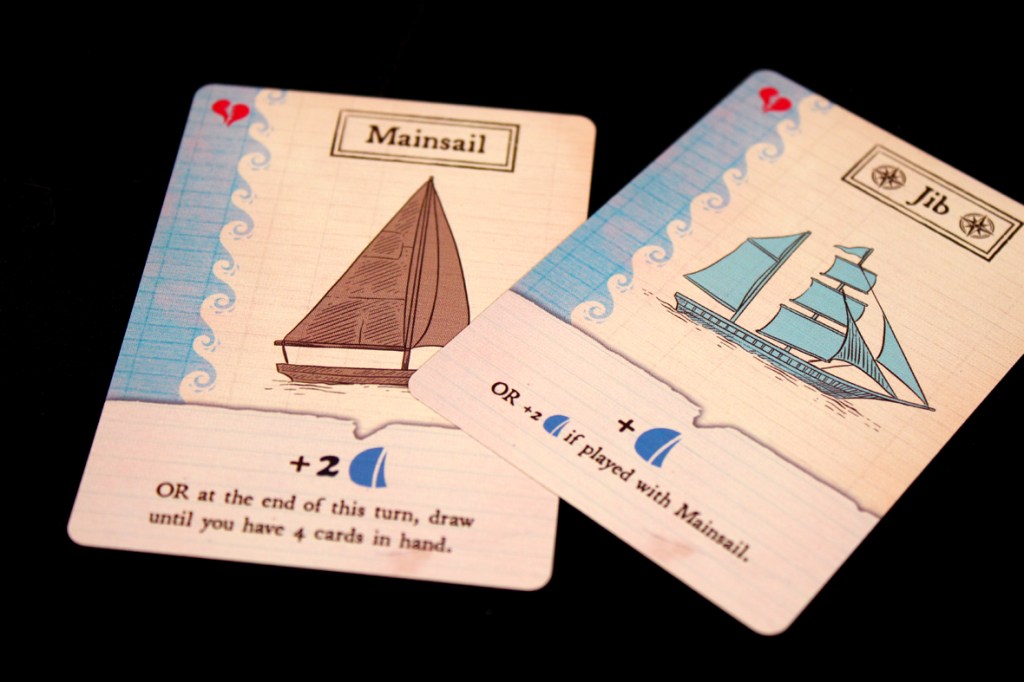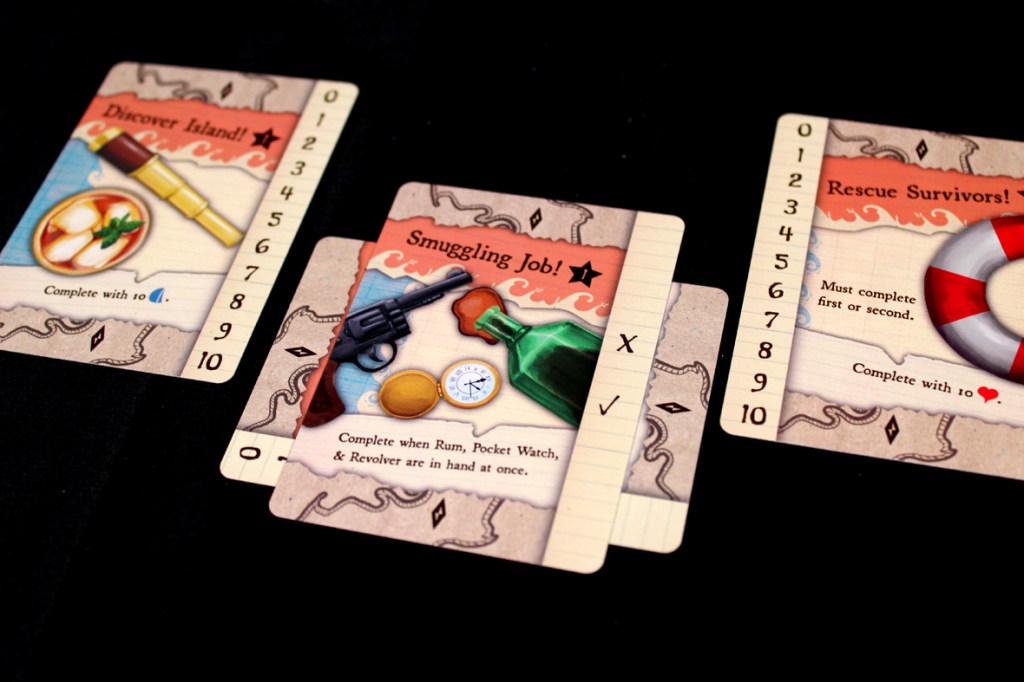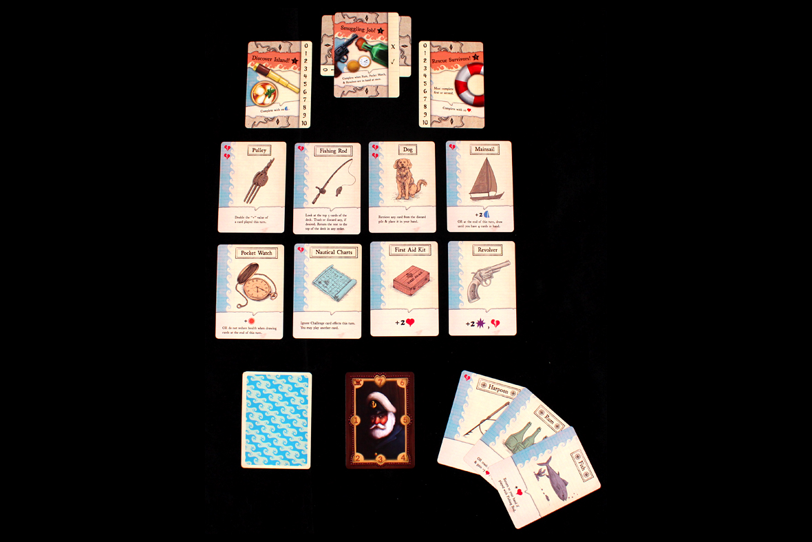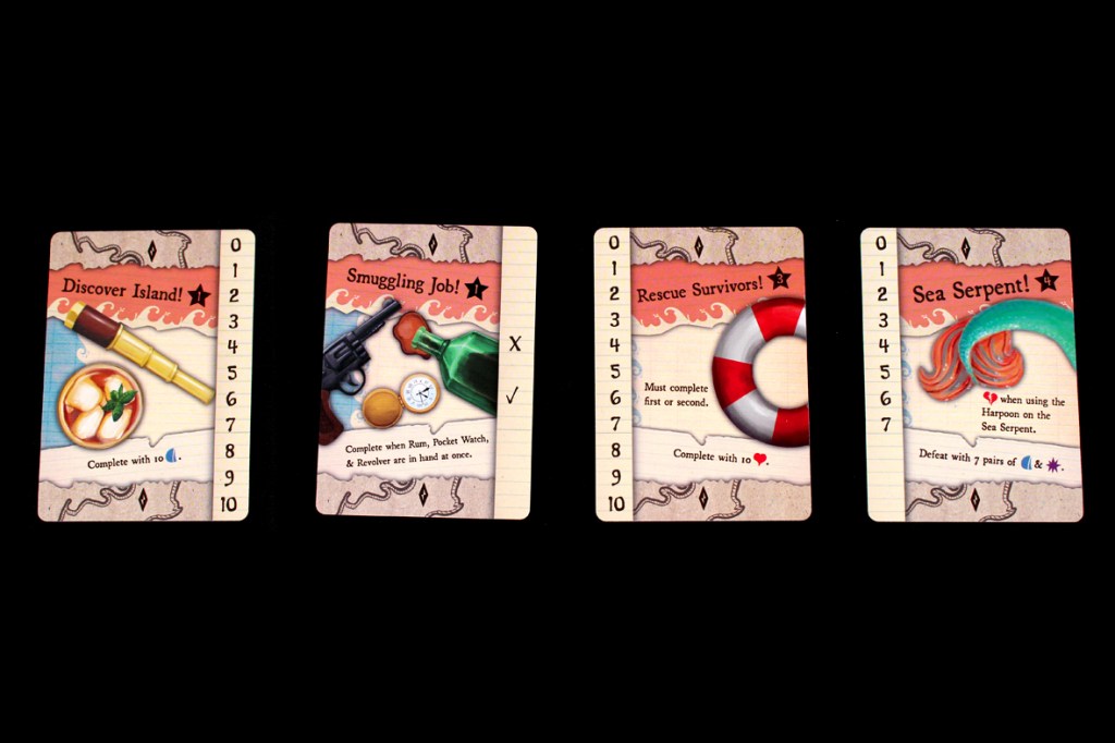 After your turn ends, you resolve the effects of incomplete challenges. This sometimes knocks out your health or punishes you for certain cards played. Any complete challenges do not activate their effects. Then, refill your hand back up to three cards. Just like at the start of the game, lose one health for each broken heart icon in the top-left corner of each card you draw from the deck. As you take damage, rotate the Captain Card so that the top number is however much health you have left.