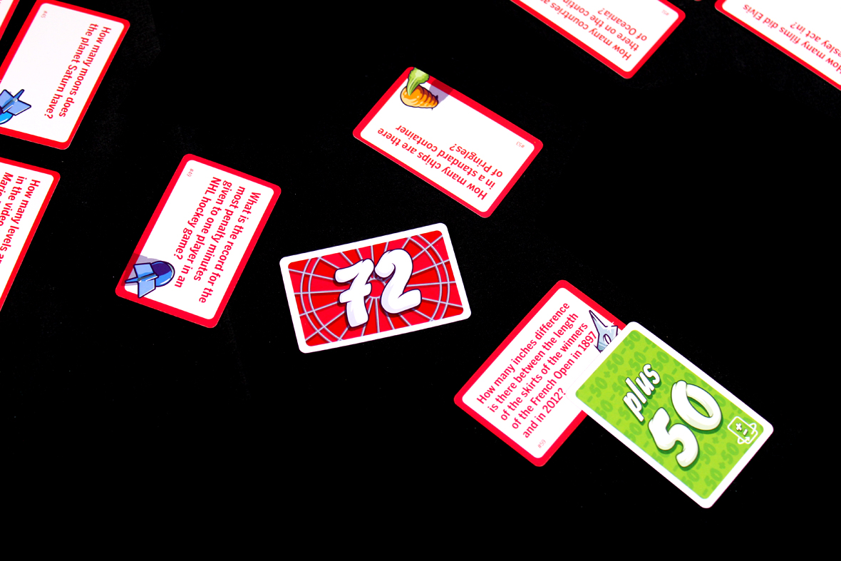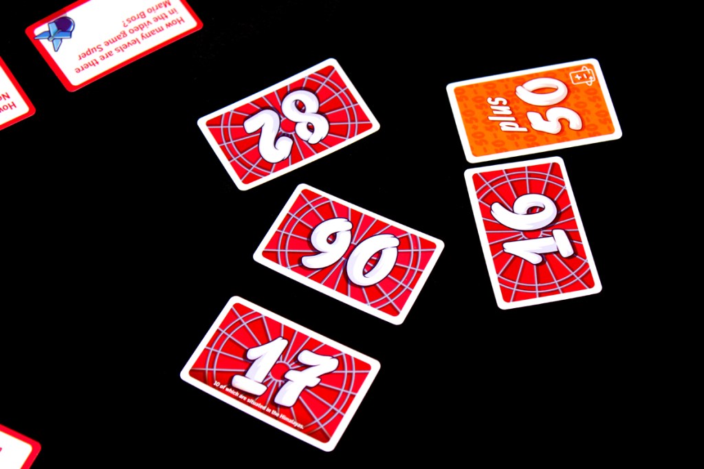 To avoid players remembering the cards, don’t shuffle them in your first go-through the deck; that ensures you’ll always have new ones for at least your first game. Place the “50” in the center of the play area and you should be good to start!