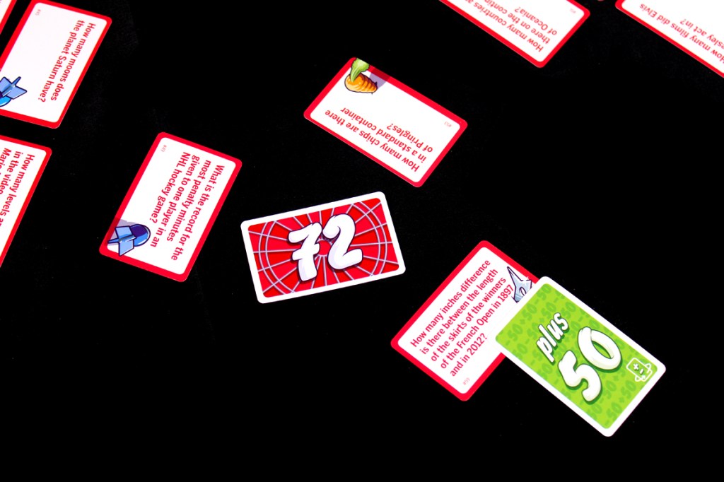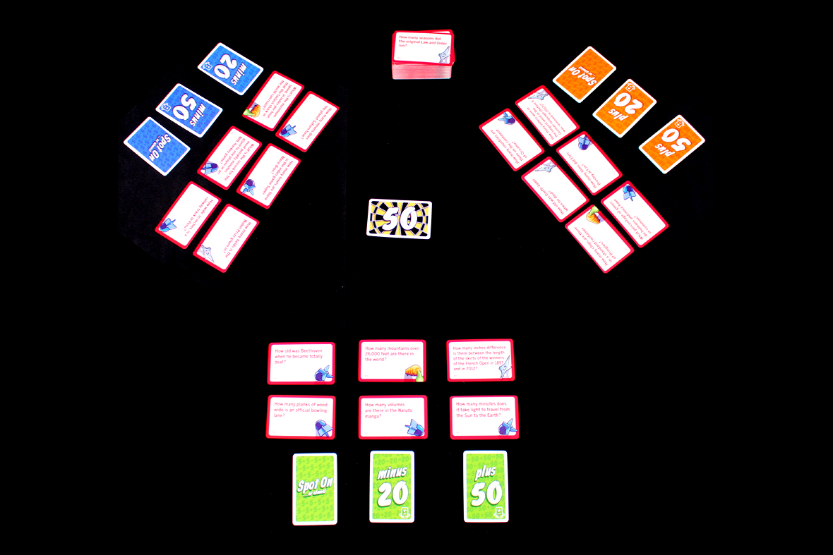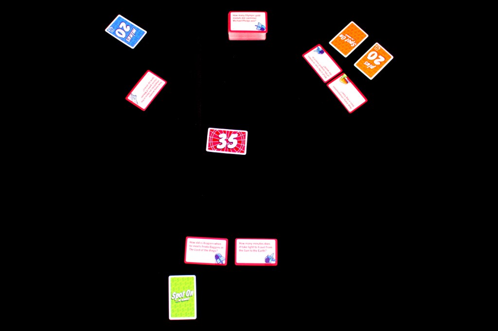 Once everyone has pushed a card forward, each team reads their question, flips it, and reads the numerical answer. The player whose number is furthest from the target number must put their number in the center, replacing the previous number. They must then draw a card to replace the Question Card they just moved to the center (this is bad). If there’s a tie, all tied players draw a new Question Card. All other cards used this round (the target number, other players’ Question Cards and Power Cards) are discarded. If any player correctly used a Spot On!, they may discard another of the Question Cards they have in front of them. Players who weren’t the furthest do not draw a card to replace their Question Card.